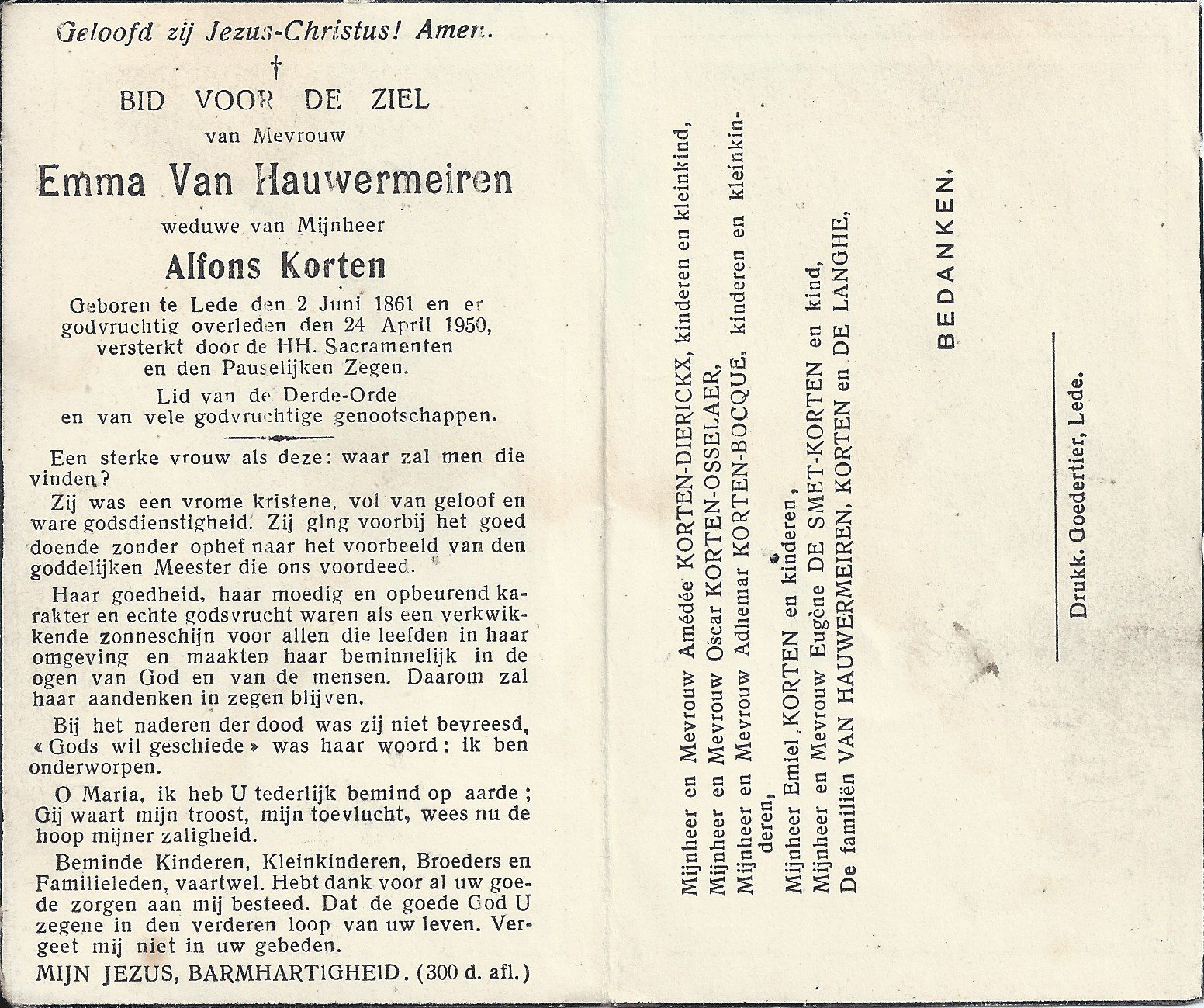 Emma Maria Van Hauwermeiren Geboren: 2 juni 1861 39 33 — Lede Overleden: 24 april 1950 — Lede |