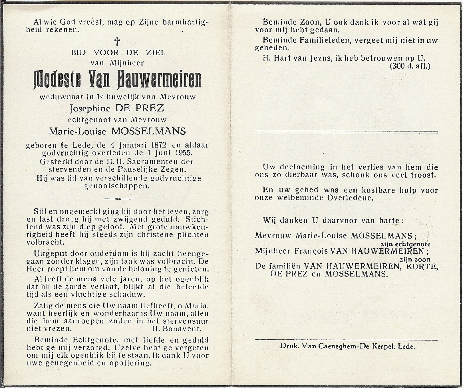 Modestus Clemens Van Hauwermeiren Geboren: 4 januari 1872 49 43 — Lede Overleden: 1 juni 1955 — Lede |
