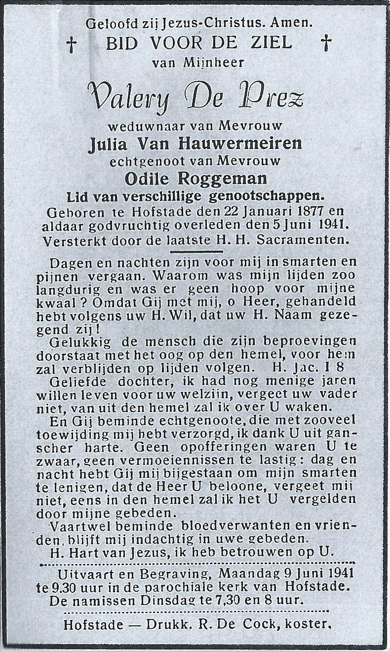 Valery De Prez Geboren: 22 januari 1877 — Hofstade Overleden: 5 juni 1941 — Hofstade |