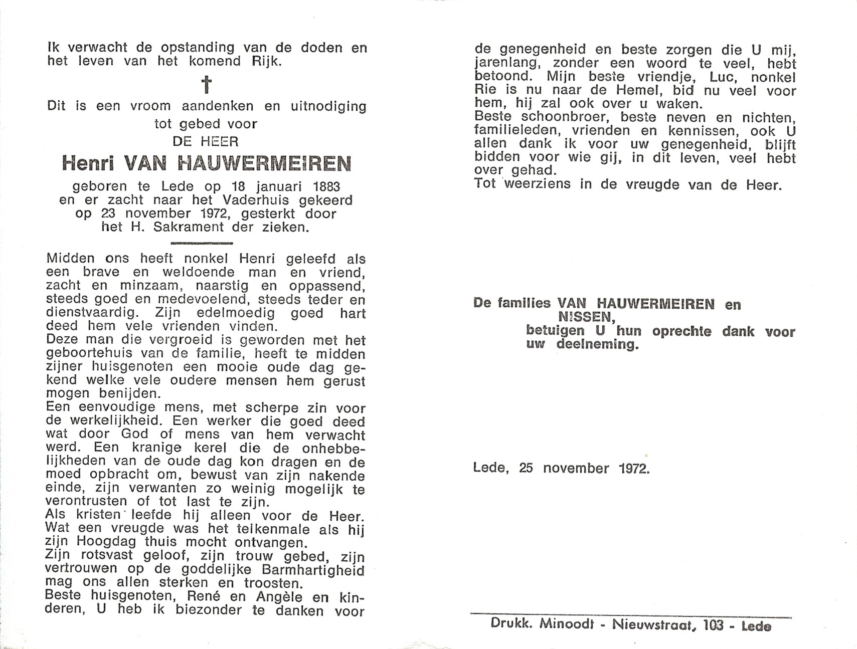 Henricus Van Hauwermeiren Geboren: 18 januari 1883 48 42 — Lede Overleden: 23 november 1972 — Lede |
