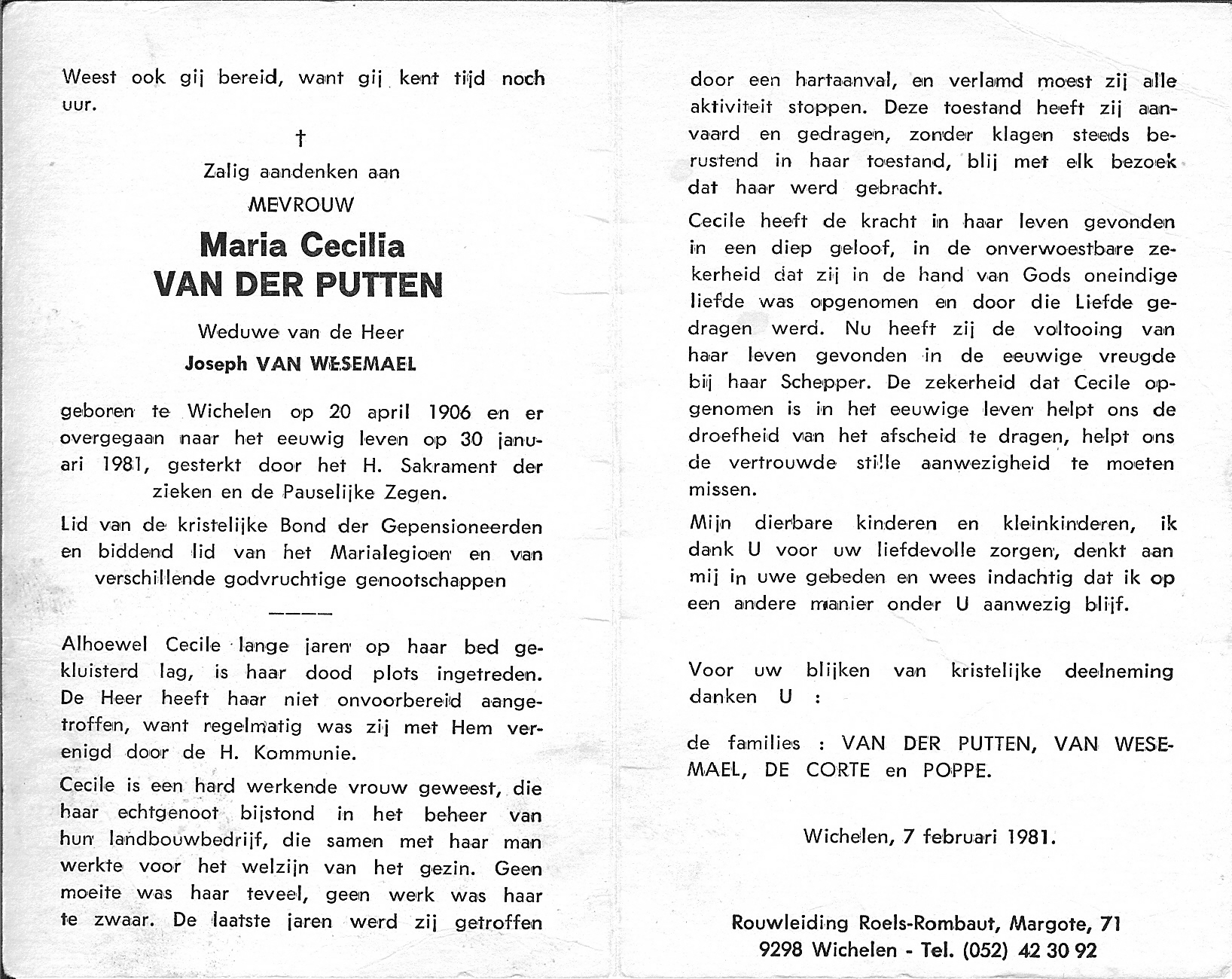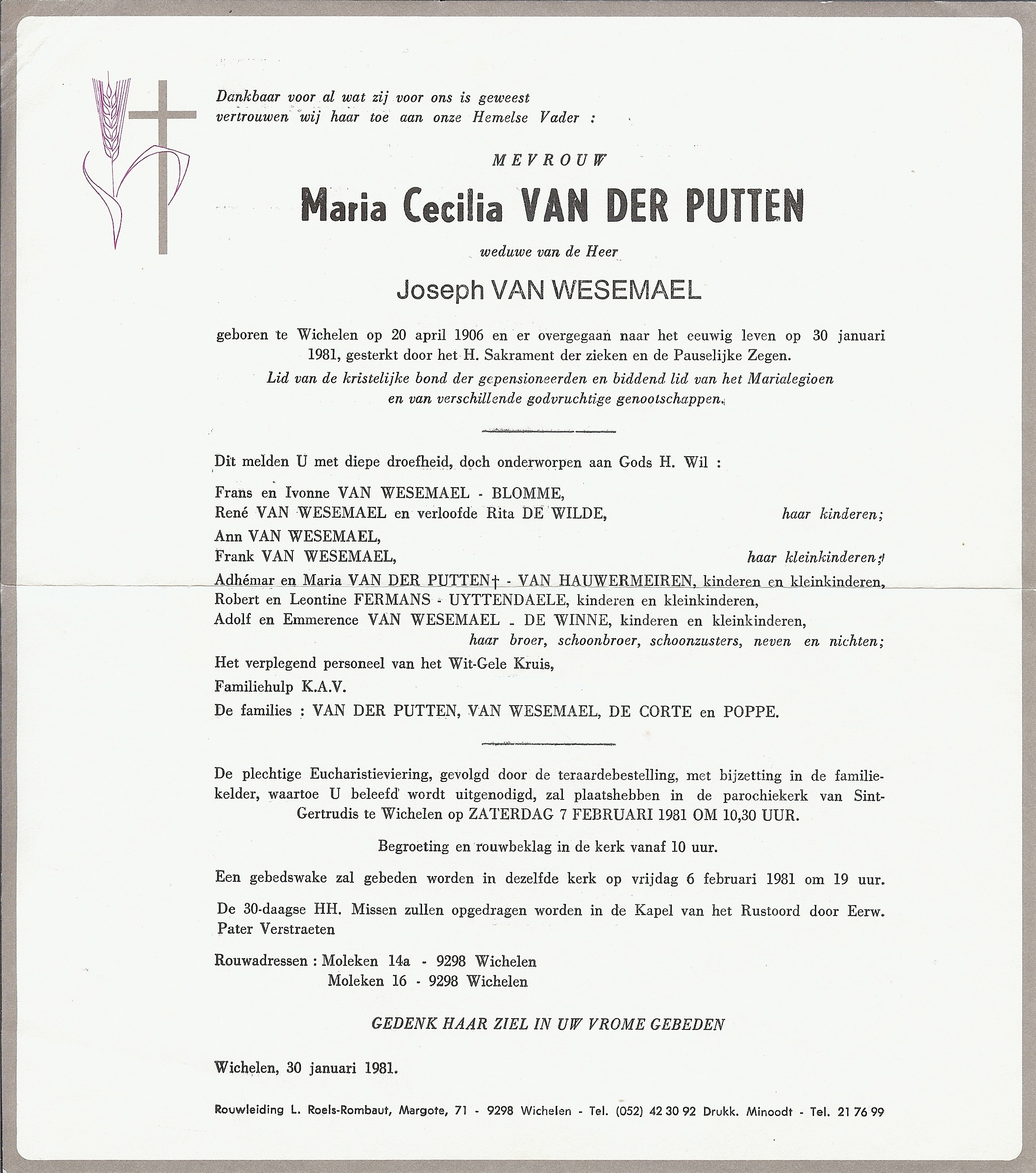 Begrafenis van moeder | Maria Cecilia Van der Putten 7 februari 1981 (Leeftijd 36 jaar) |