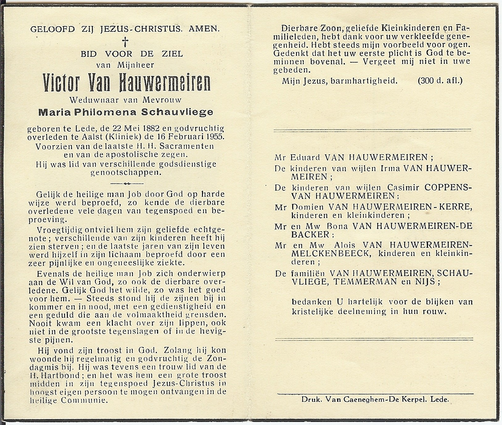 Victor Van Hauwermeiren Geboren: 22 mei 1882 39 38 — Lede Overleden: 16 februari 1955 — Aalst |