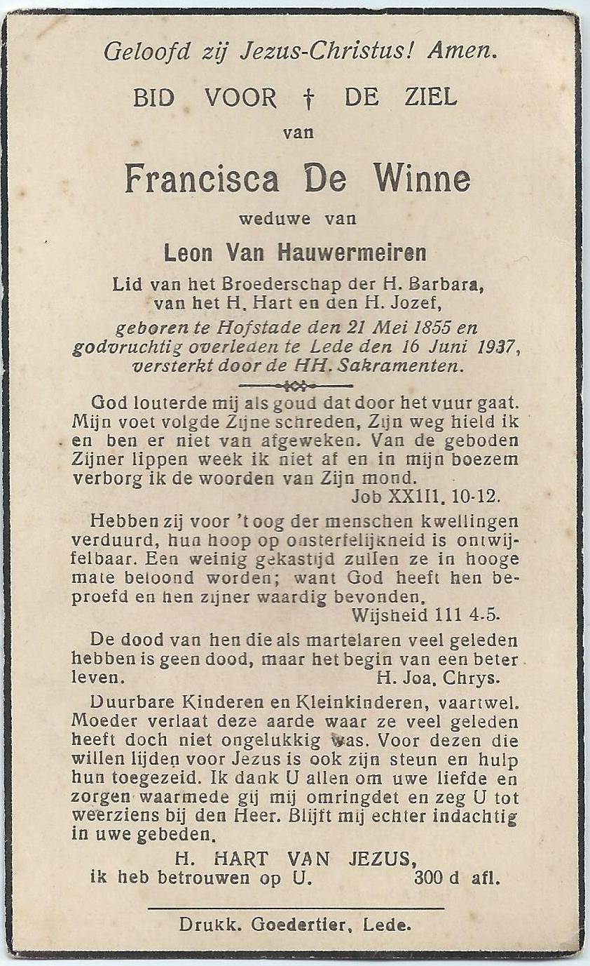 Francisca De Winne Geboren: 21 mei 1855 — Hofstade Overleden: 16 juni 1937 — Lede |