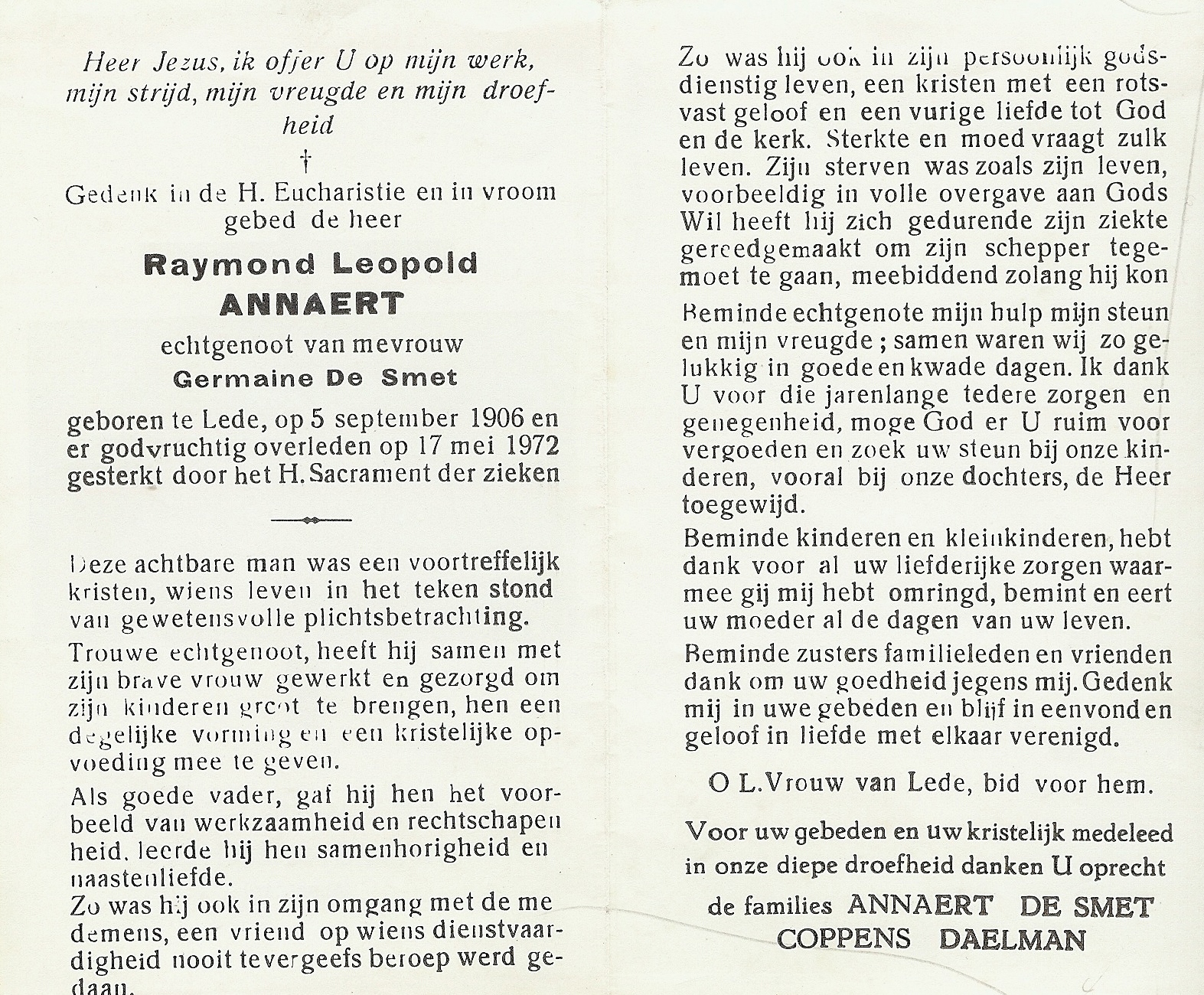 Overlijden van een broer | Raymond Leopold Annaert 17 mei 1972 (Leeftijd 70 jaar) |