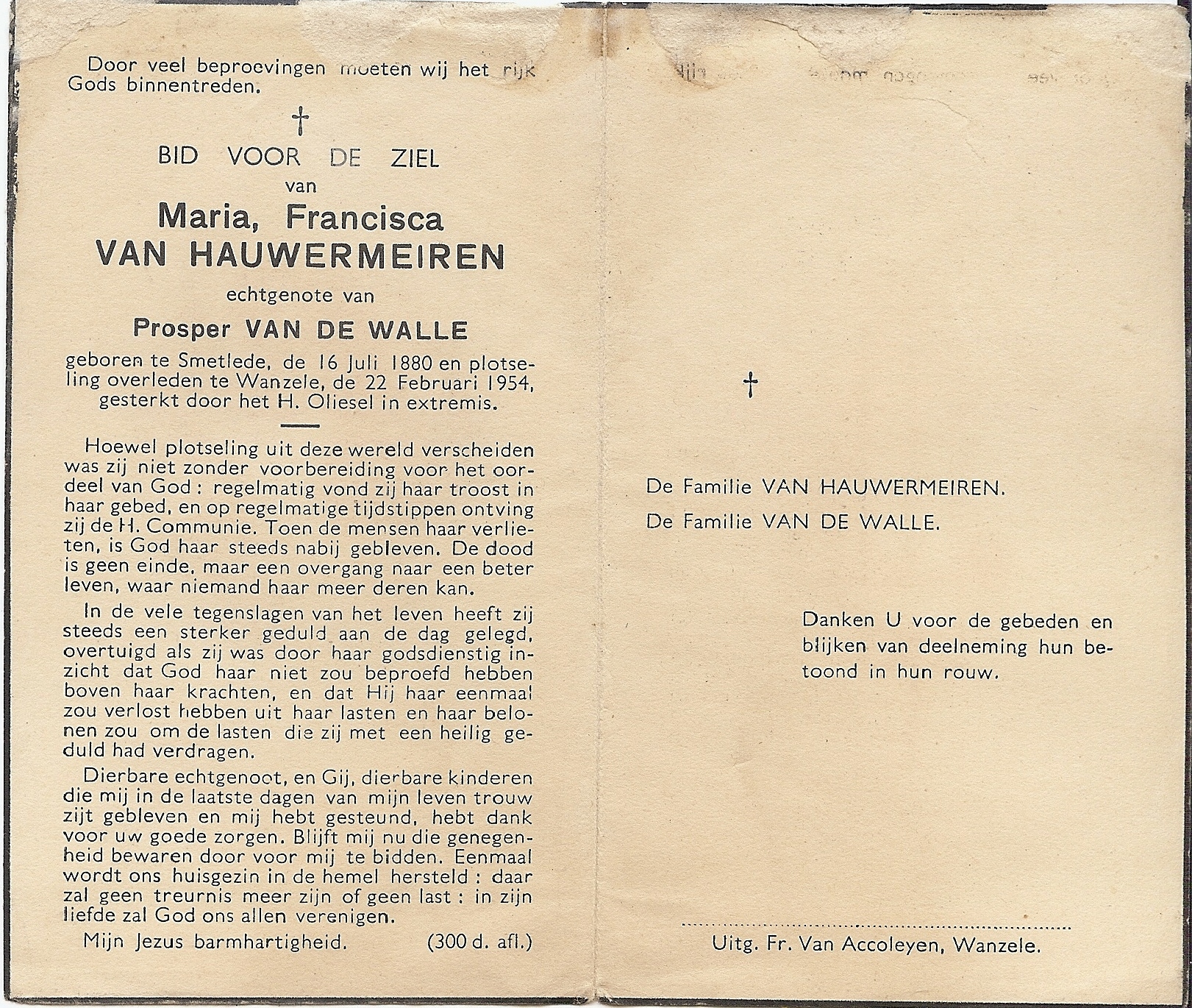 Maria Francisca Van Hauwermeiren Geboren: 16 juli 1880 30 28 — Smetlede Overleden: 22 februari 1954 — Wanzele |
