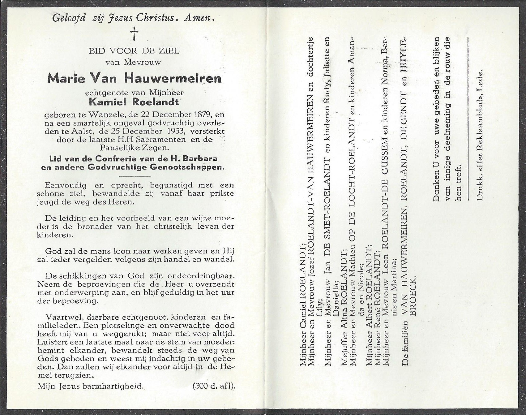 Marie Van Hauwermeiren Geboren: 22 december 1879 27 27 — Wanzele Overleden: 25 december 1953 — Aalst |