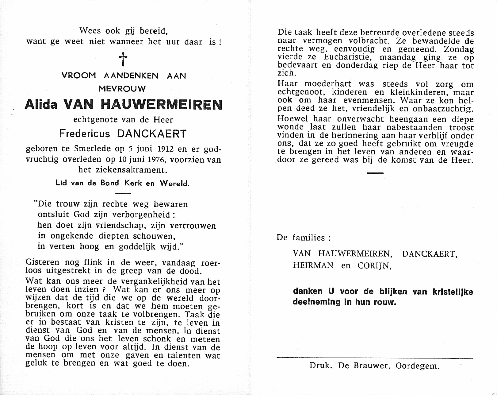 Alida Francisca Van Hauwermeiren Geboren: 5 juni 1912 35 41 — Smetlede Overleden: 10 juni 1976 — Smetlede |