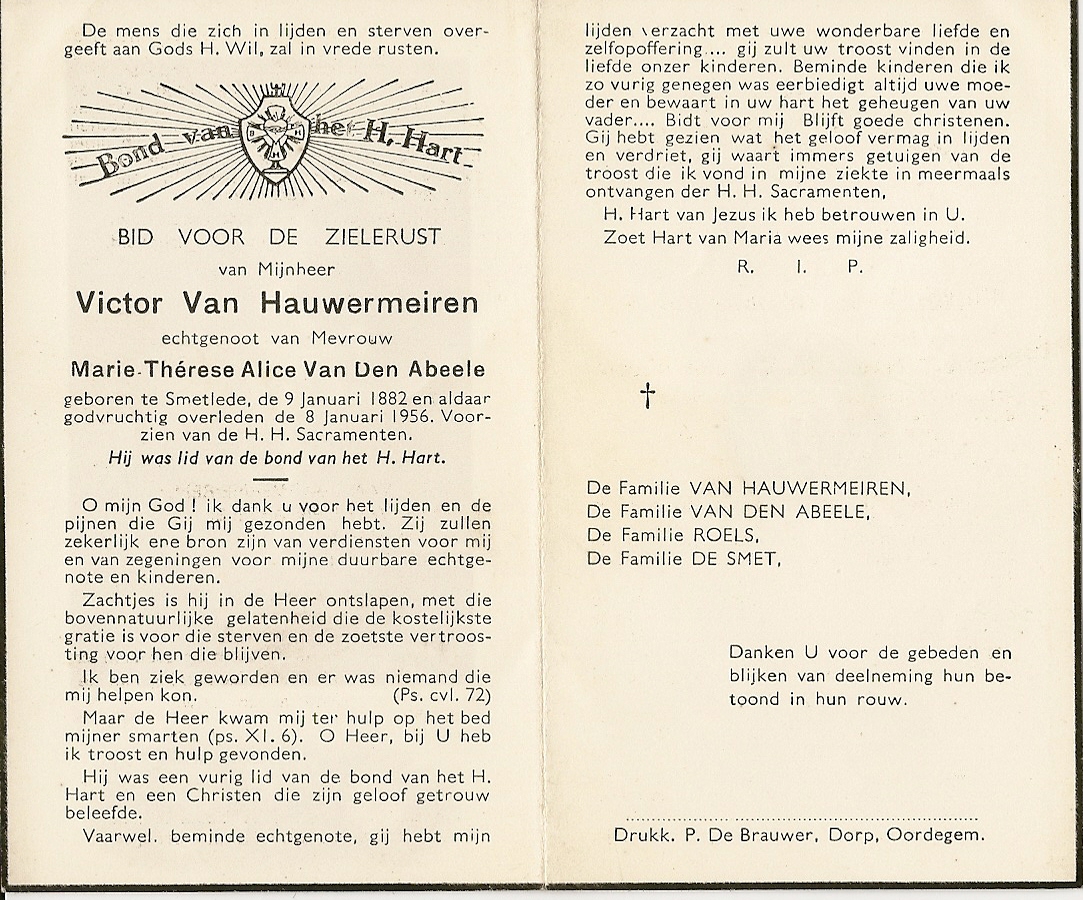 Victorinus Van Hauwermeiren Geboren: 9 januari 1882 32 30 — Smetlede Overleden: 8 januari 1956 — Smetlede |