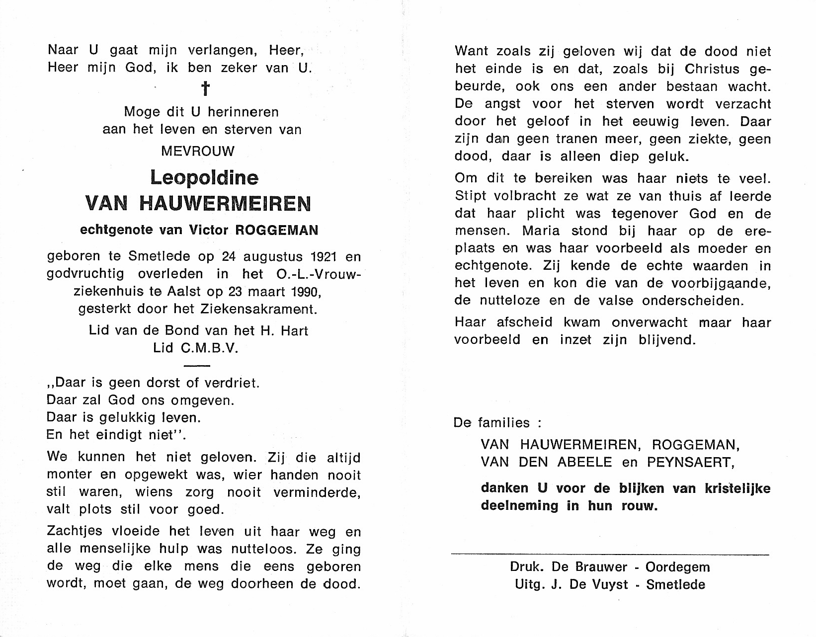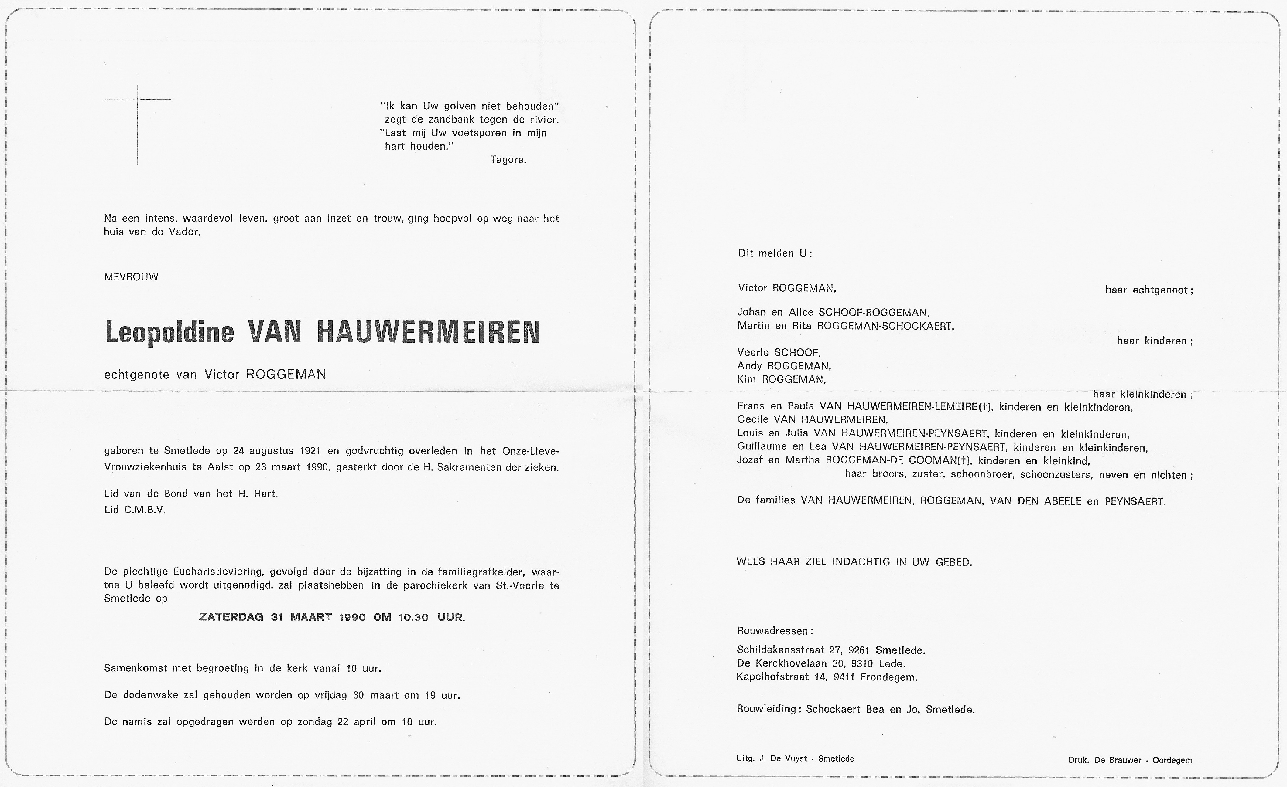 Leopoldine Van Hauwermeiren Geboren: 24 augustus 1921 39 37 — Smetlede Overleden: 23 maart 1990 — Aalst |