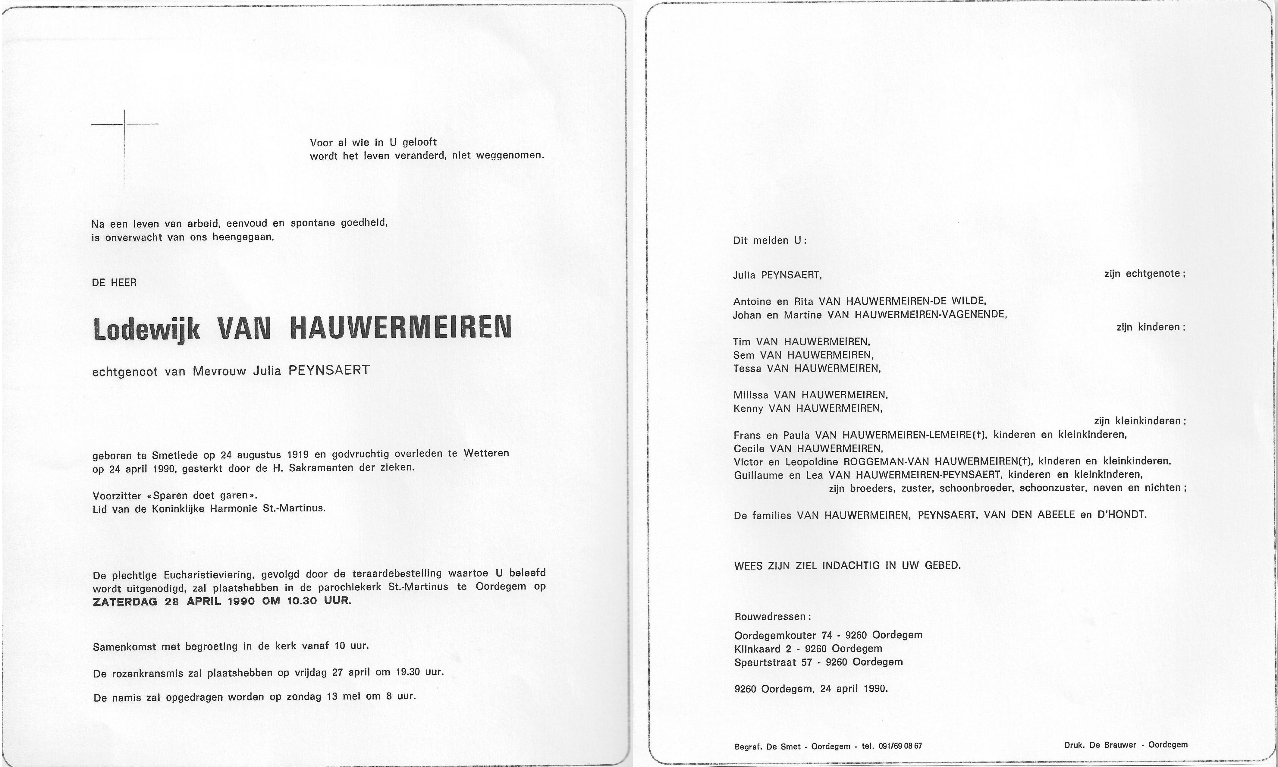 Lodewijk Maria Van Hauwermeiren Geboren: 24 augustus 1919 37 35 — Smetlede Overleden: 24 april 1990 — Wetteren |