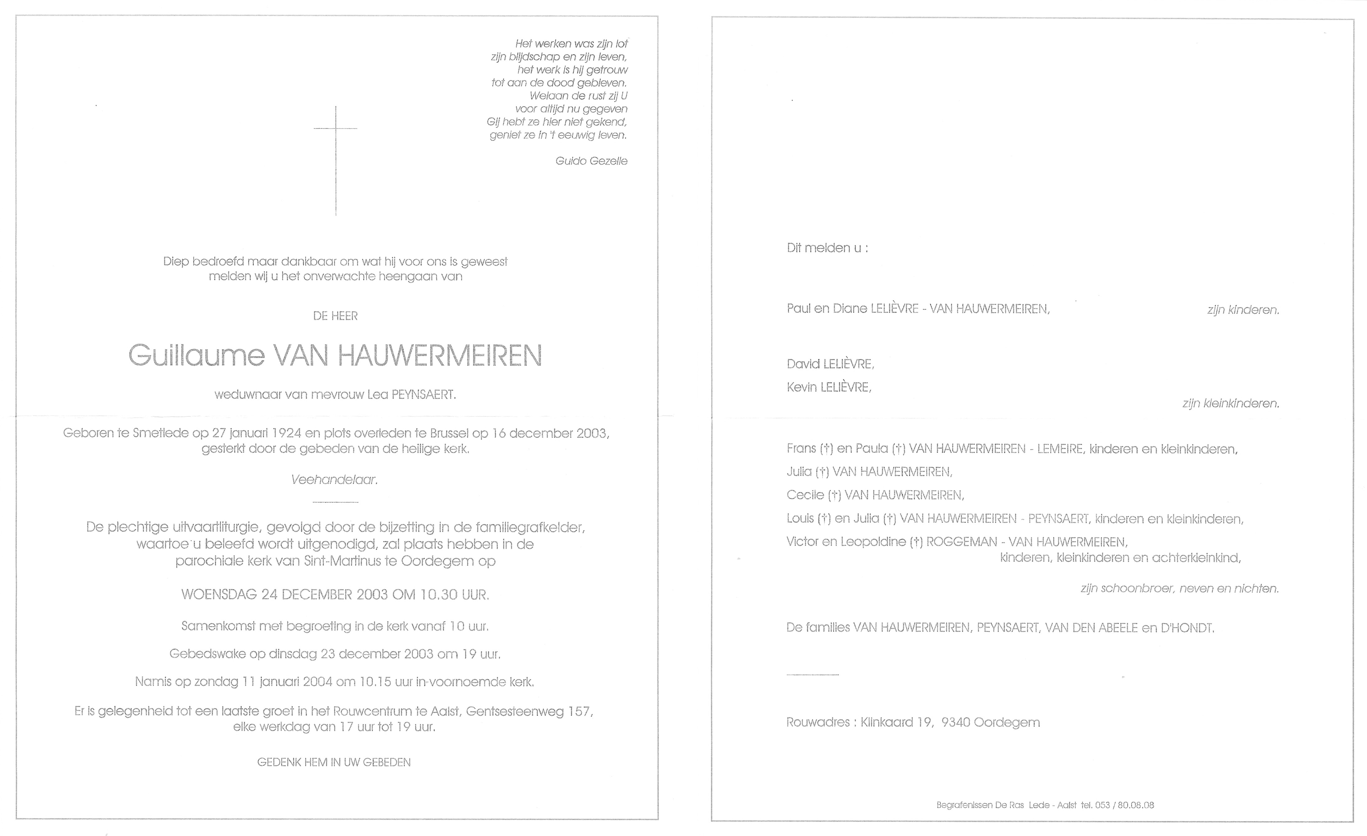 Begrafenis van een broer | Frans Van Hauwermeiren 8 januari 1993 (Leeftijd 68 jaar) |
