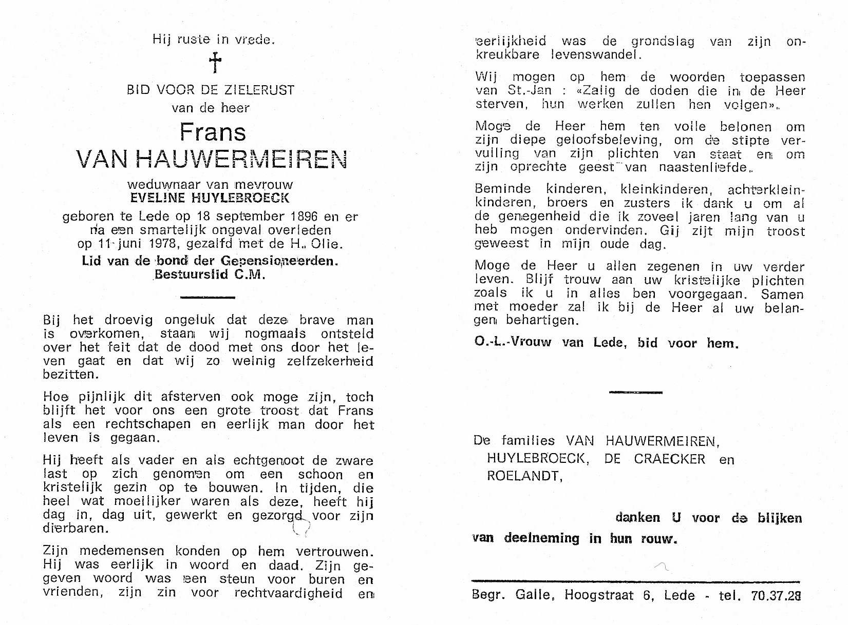 Begrafenis van vader | Franciscus Xaverius Van Hauwermeiren 15 juni 1978 (Leeftijd 55 jaar) |
