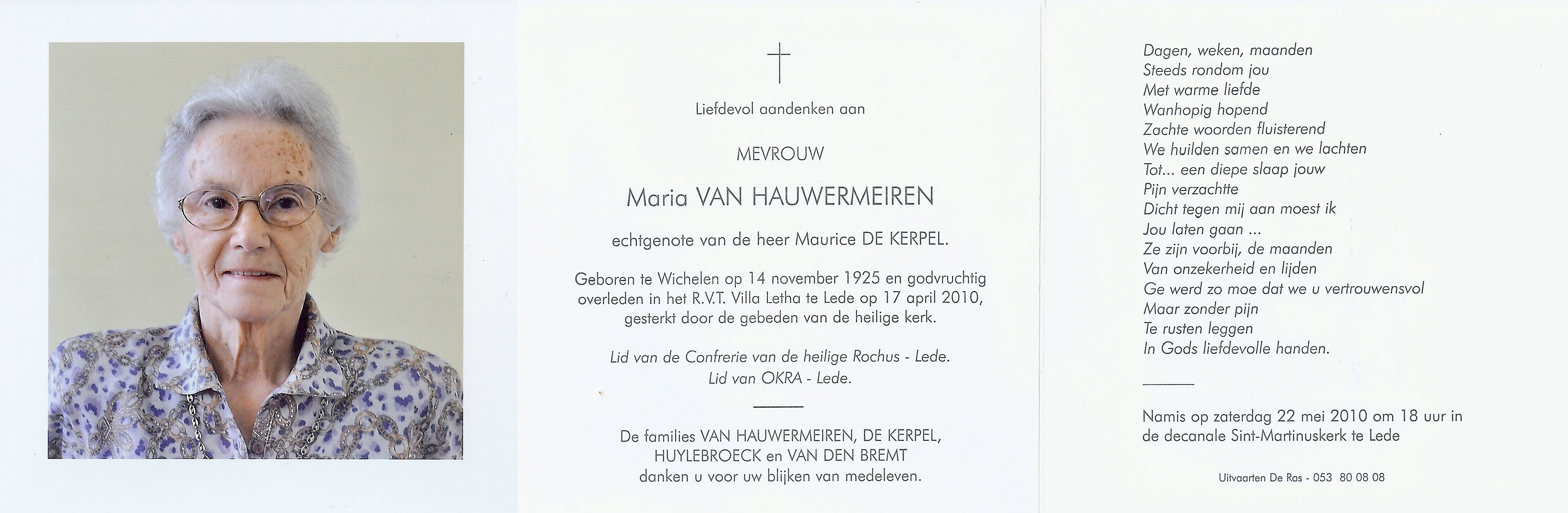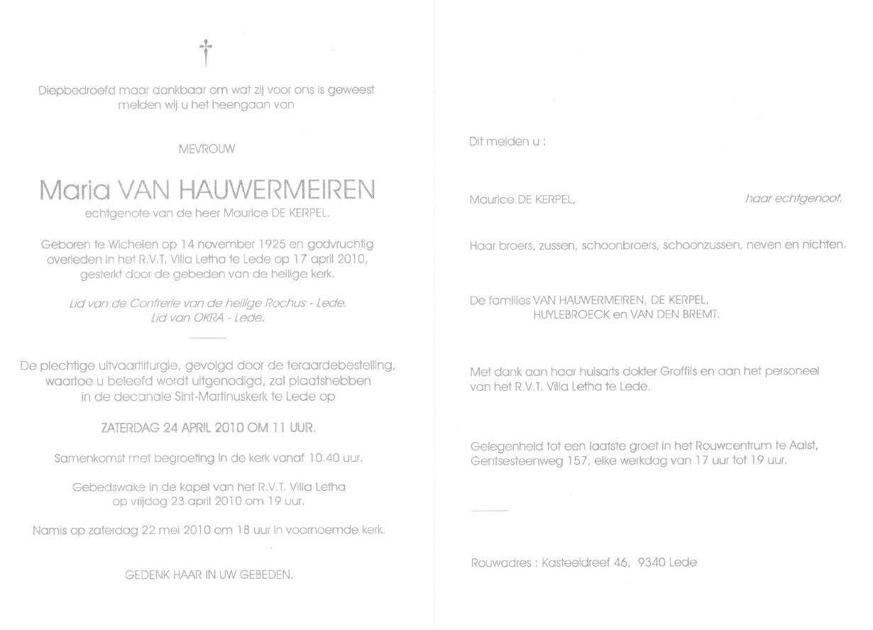 Begrafenis van een zus | Maria Van Hauwermeiren 24 april 2010 (Leeftijd 87 jaar) |