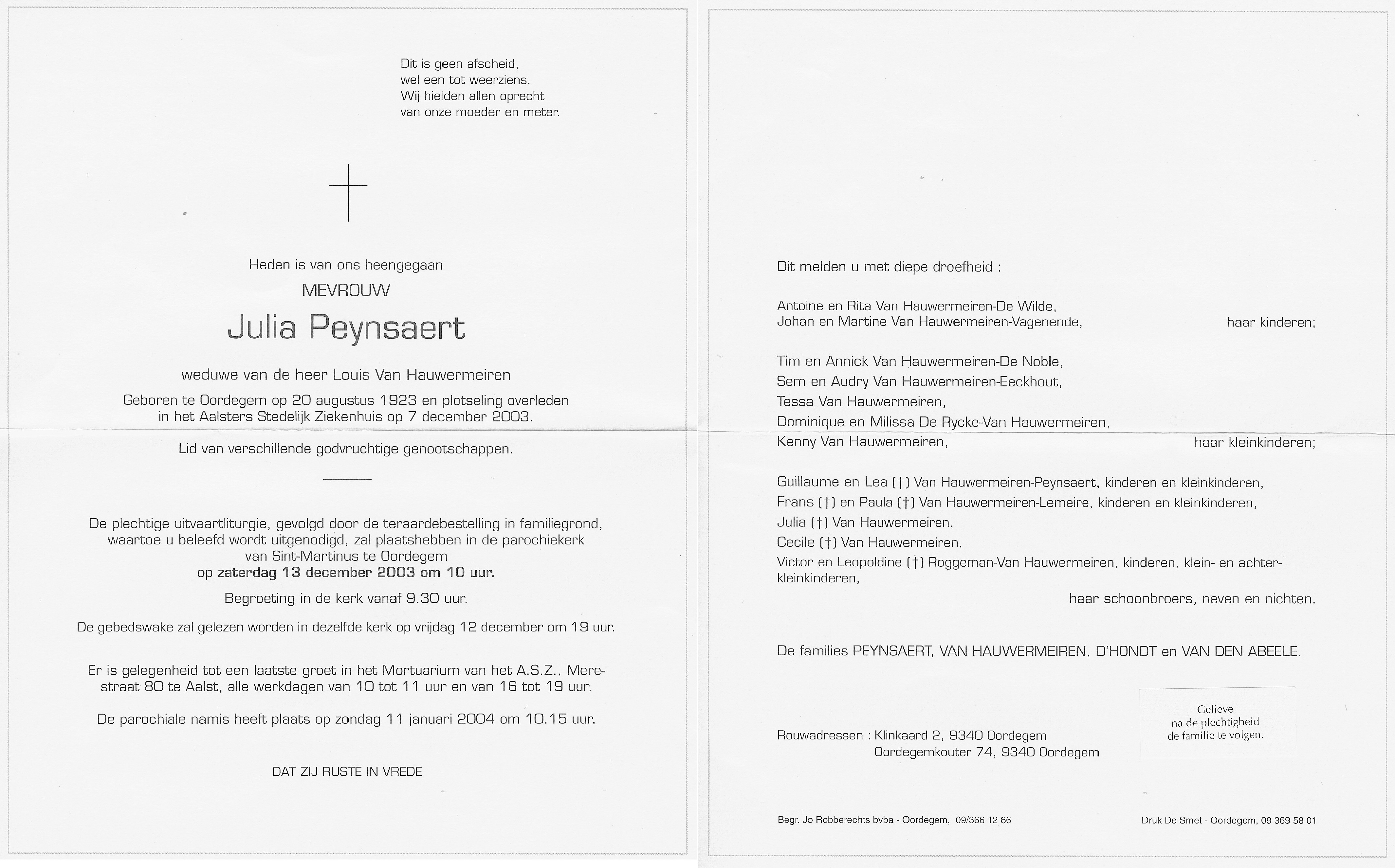 Begrafenis van een zus | Lea Henrica Peynsaert 24 april 1999 (Leeftijd 75 jaar) |