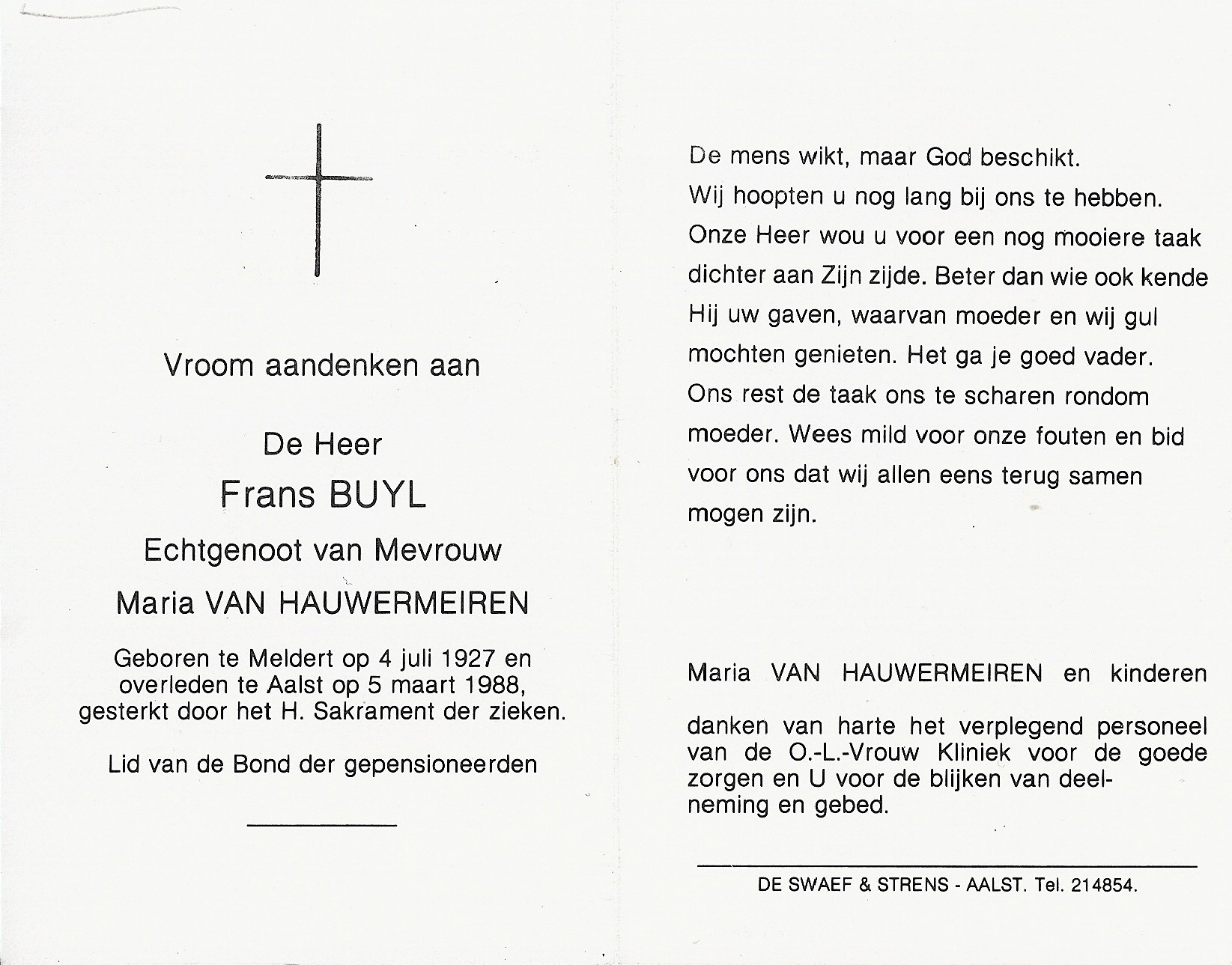 Frans Buyl Geboren: 4 juli 1927 — Meldert Overleden: 5 maart 1988 — Aalst |