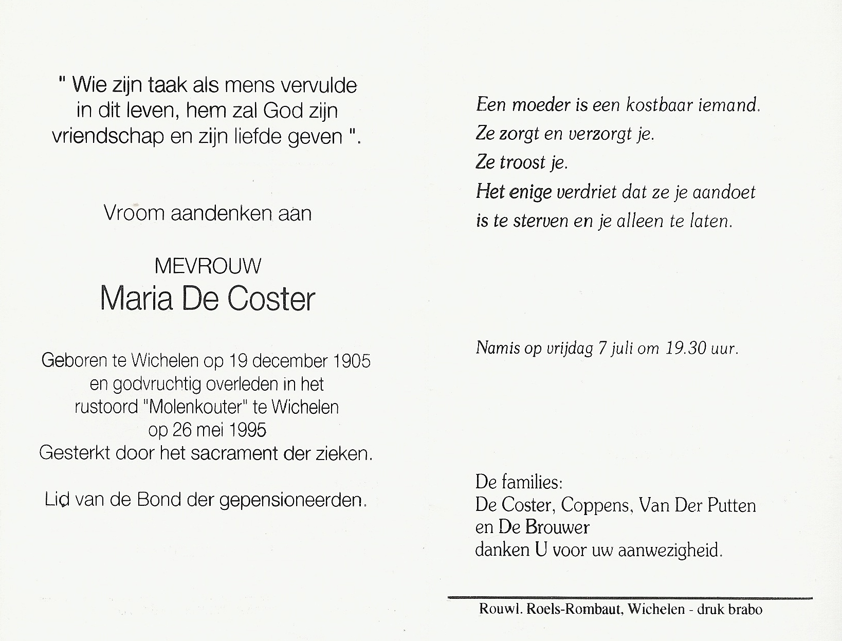 Maria De Coster Geboren: 19 december 1905 30 25 — Wichelen Overleden: 26 mei 1995 — Wichelen |