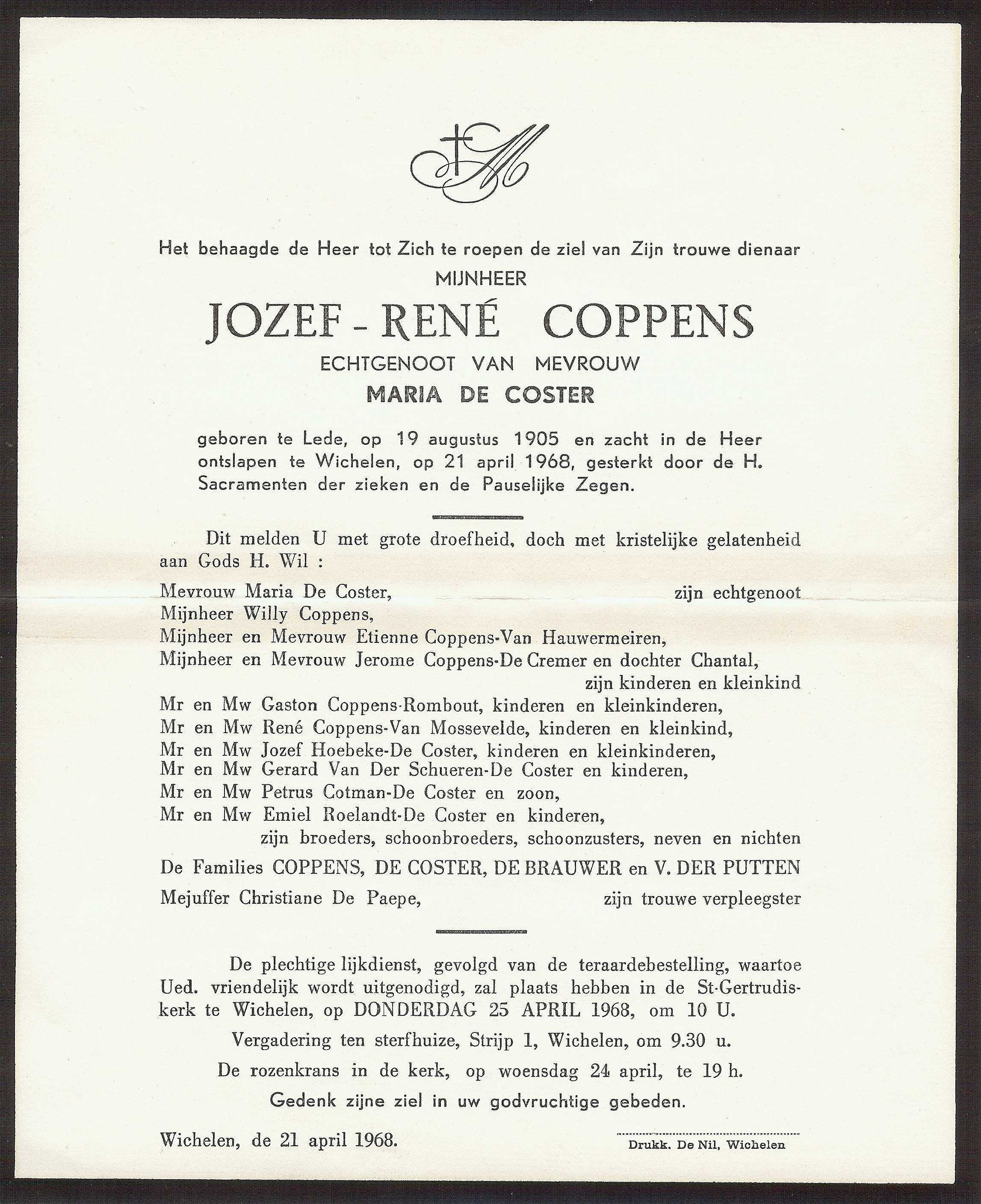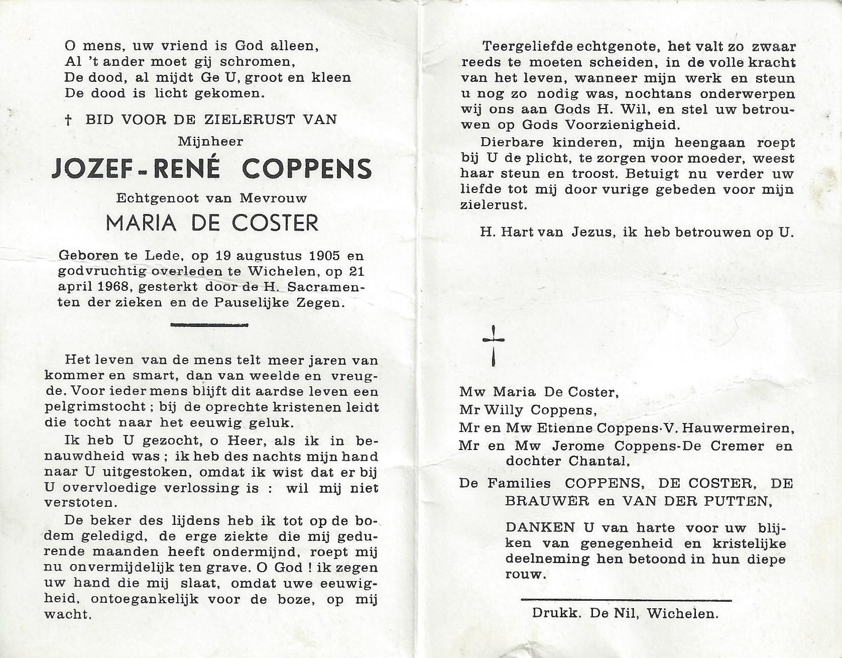 Jozef-René Coppens Geboren: 19 augustus 1905 — Lede Overleden: 21 april 1968 — Wichelen |