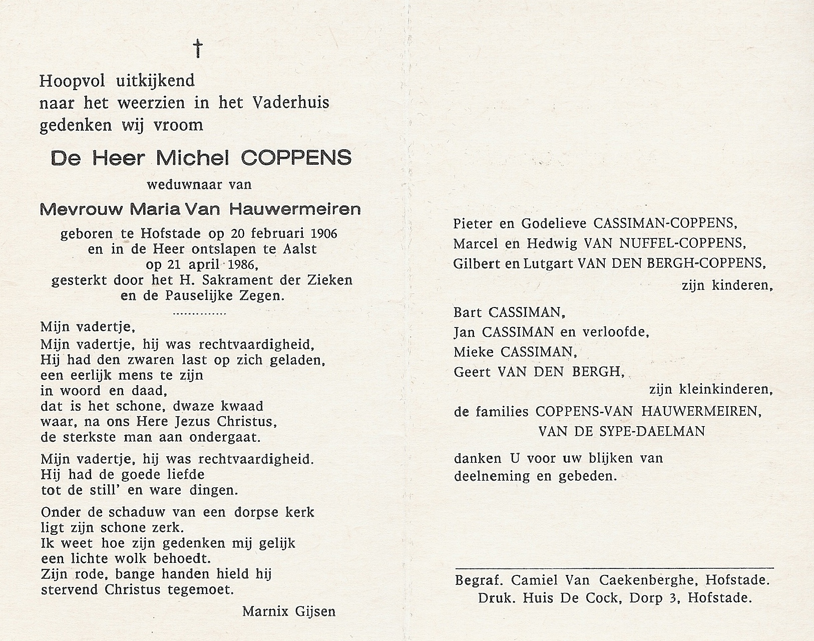 Michel-Emiel Coppens Geboren: 20 februari 1906 — Hofstade Overleden: 21 april 1986 — Aalst |