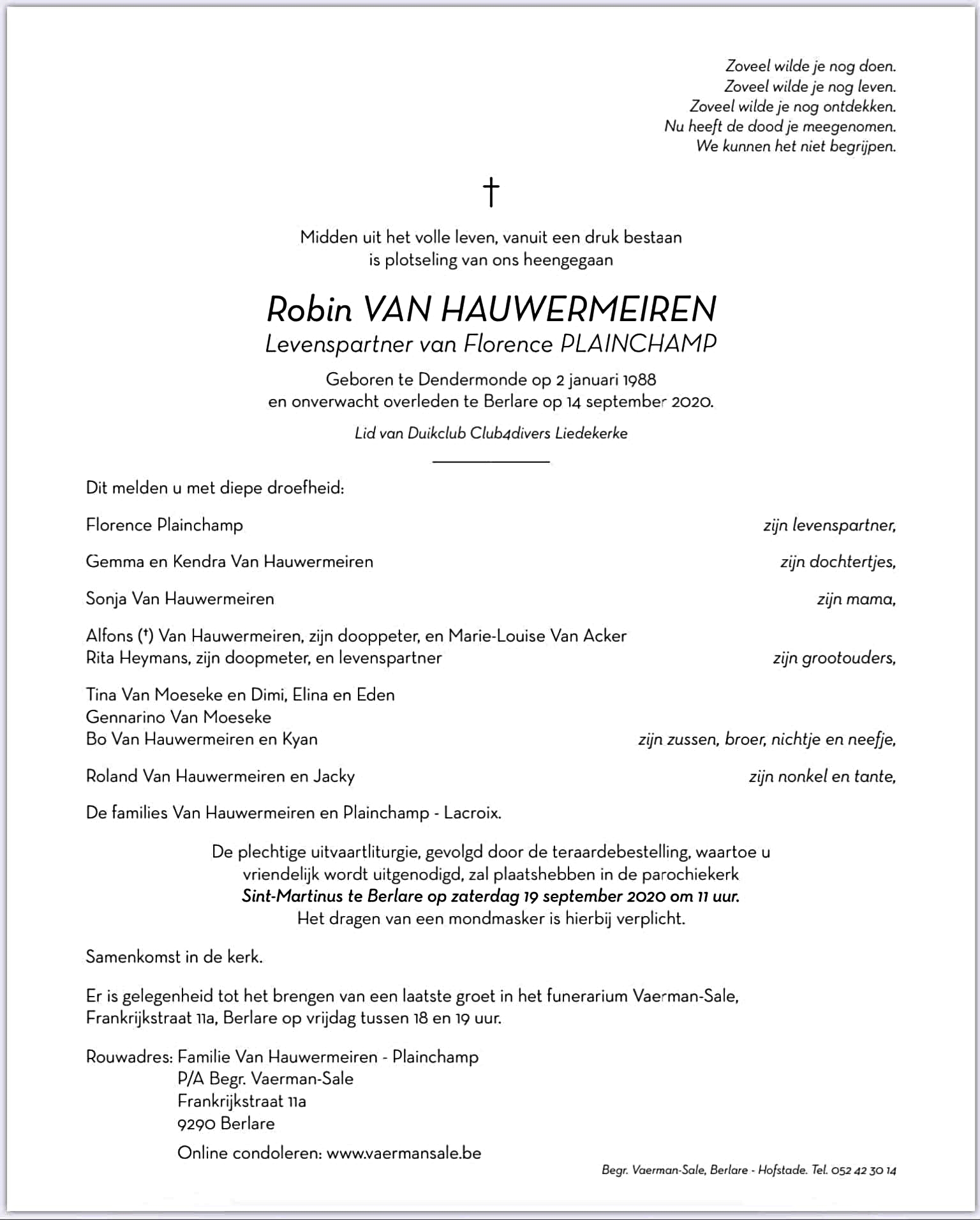 Robin Van Hauwermeiren Geboren: 2 januari 1988 — Dendermonde Overleden: 14 september 2020 — Berlare |