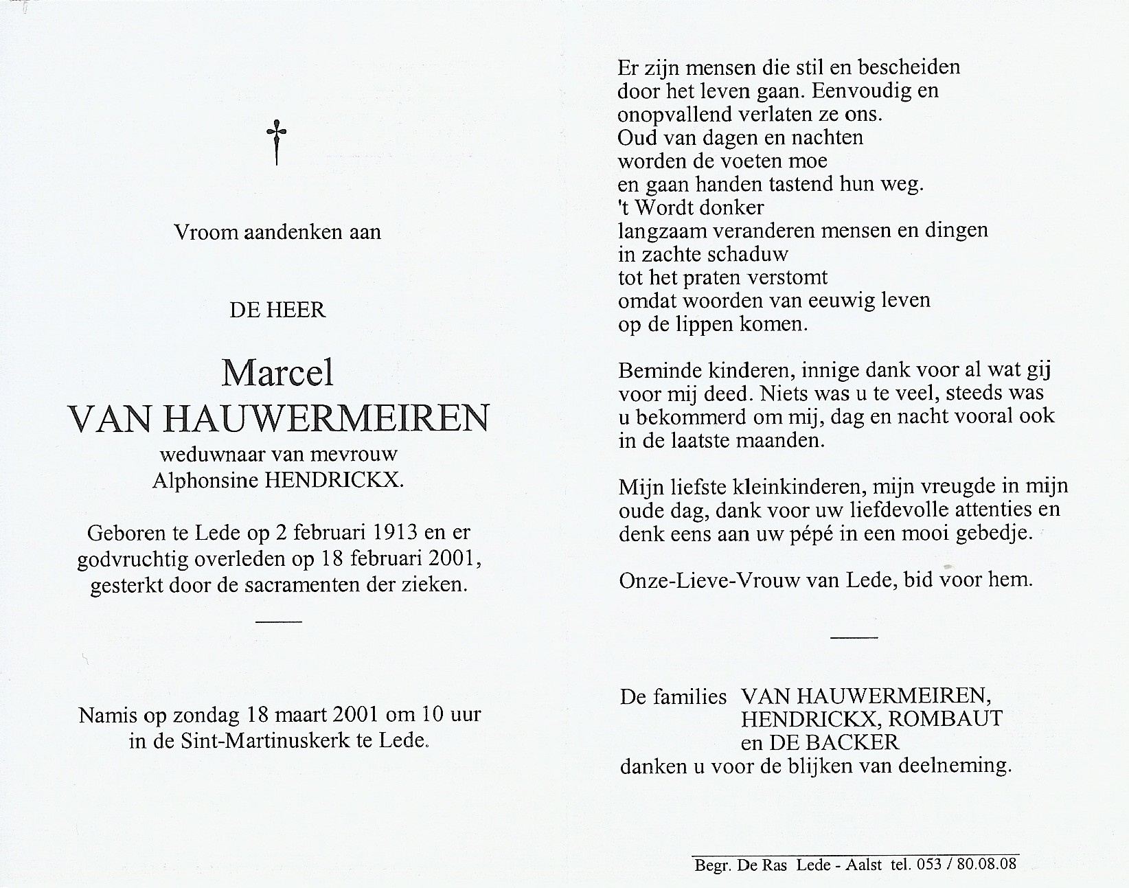Victor Marcellus Van Hauwermeiren Geboren: 2 februari 1913 30 30 — Lede Overleden: 18 februari 2001 — Lede |