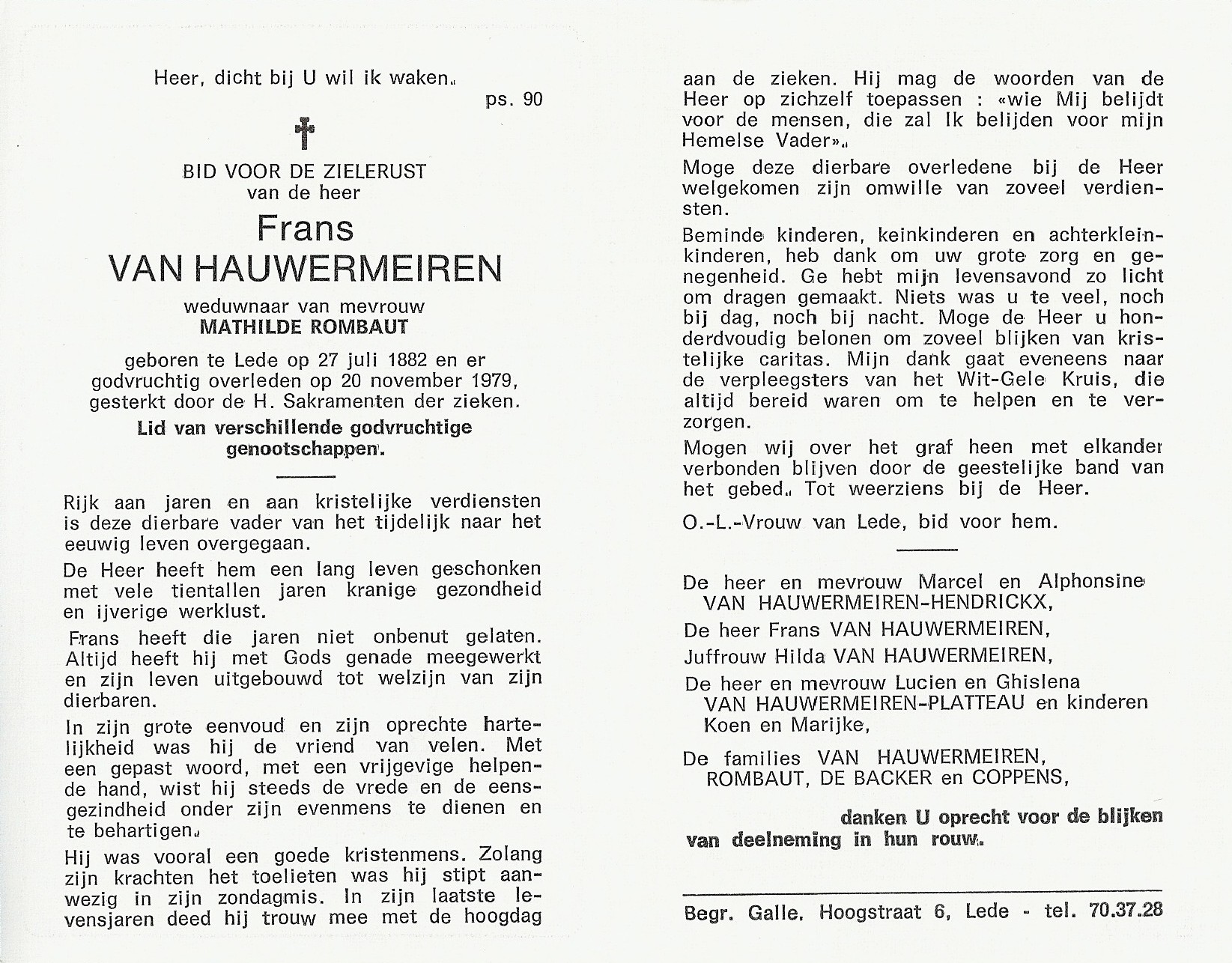 Franciscus Van Hauwermeiren Geboren: 27 juli 1882 37 32 — Lede Overleden: 20 november 1979 — Lede |