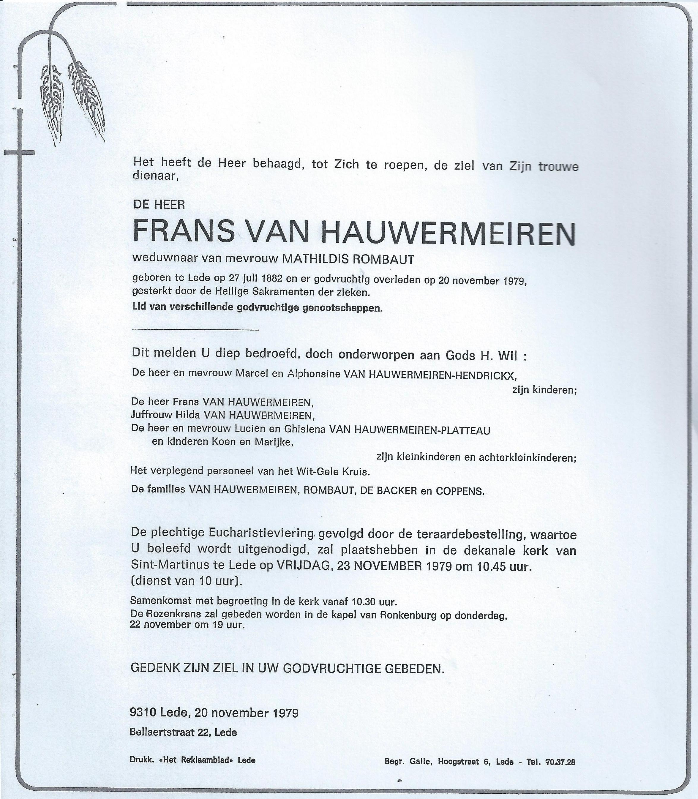 Begrafenis van vader | Franciscus Van Hauwermeiren 23 november 1979 (Leeftijd 66 jaar) |