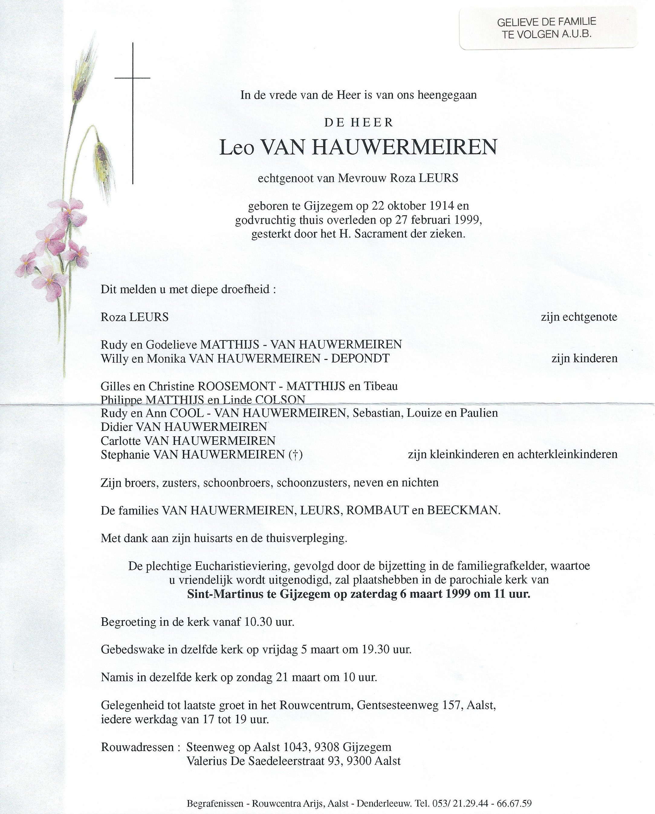 Franciscus Leo Van Hauwermeiren Geboren: 22 oktober 1914 33 27 — Gijzegem Overleden: 27 februari 1999 — Gijzegem |
