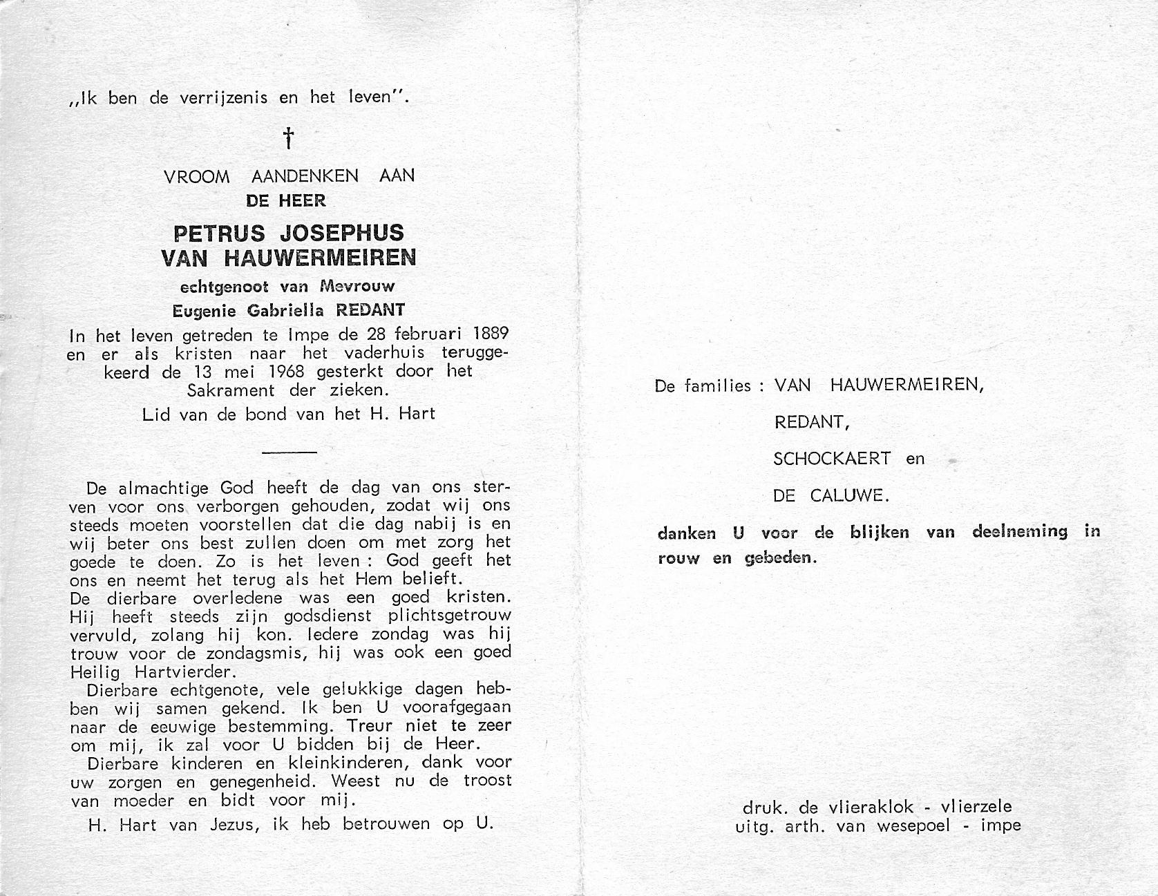 Petrus Josephus Van Hauwermeiren Geboren: 28 februari 1889 34 34 — Impe Overleden: 13 mei 1968 — Impe |