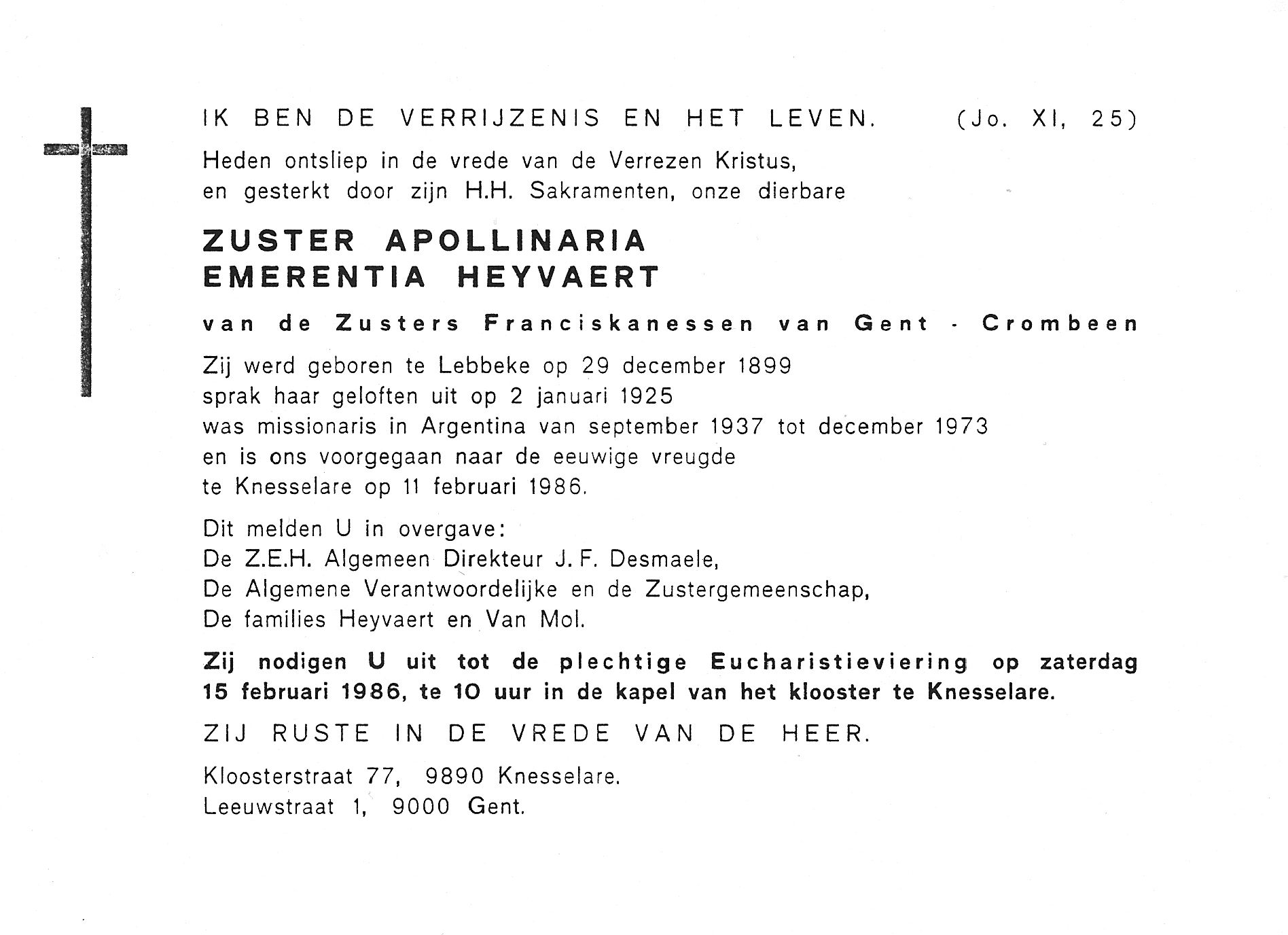 Emerence Heyvaert Geboren: 29 december 1899 29 26 — Lebbeke Overleden: 11 februari 1986 — Knesselare |