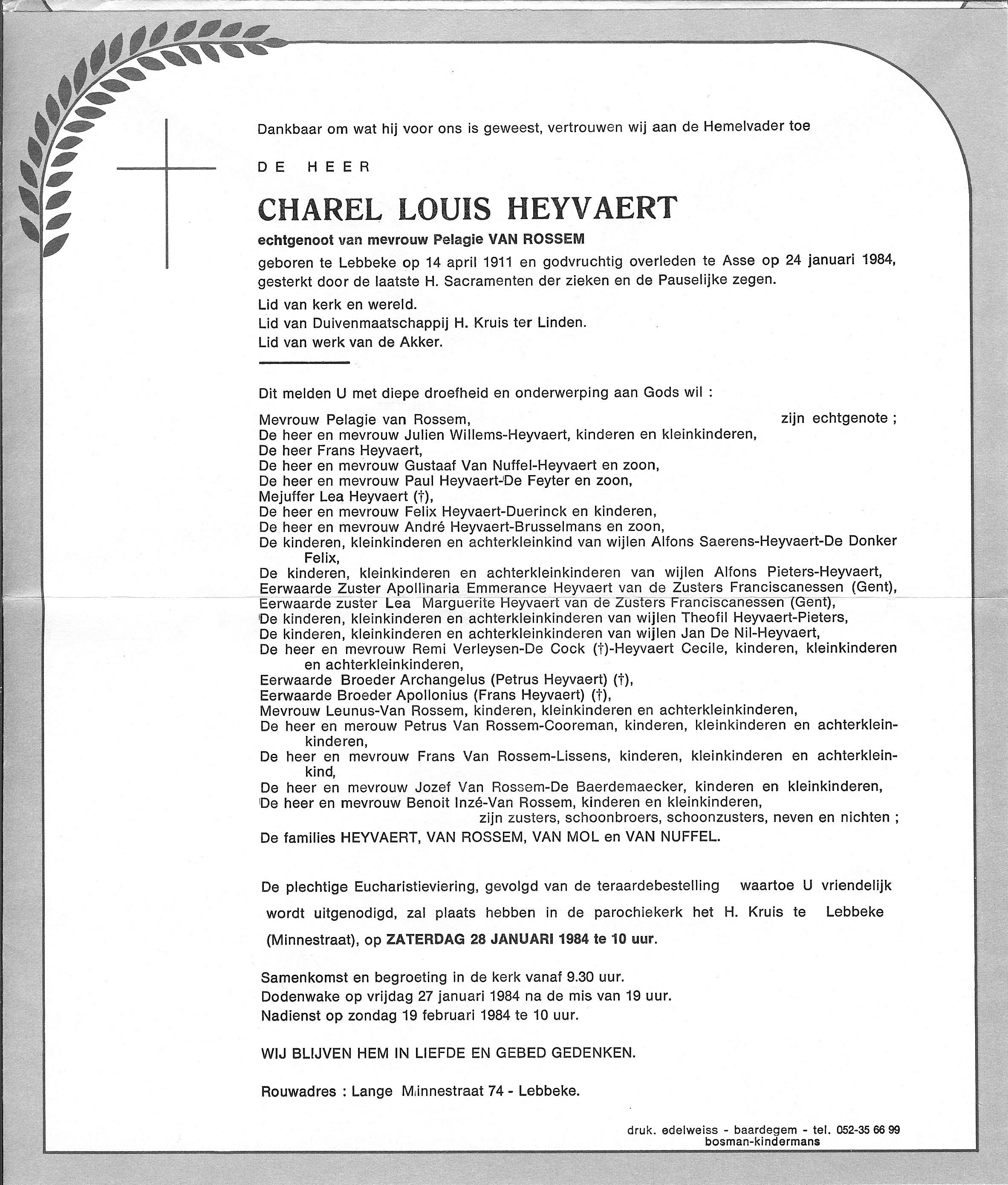 Overlijden van een echtgenoot | Charles Louis Heyvaert 24 januari 1984 (Leeftijd 75 jaar) |