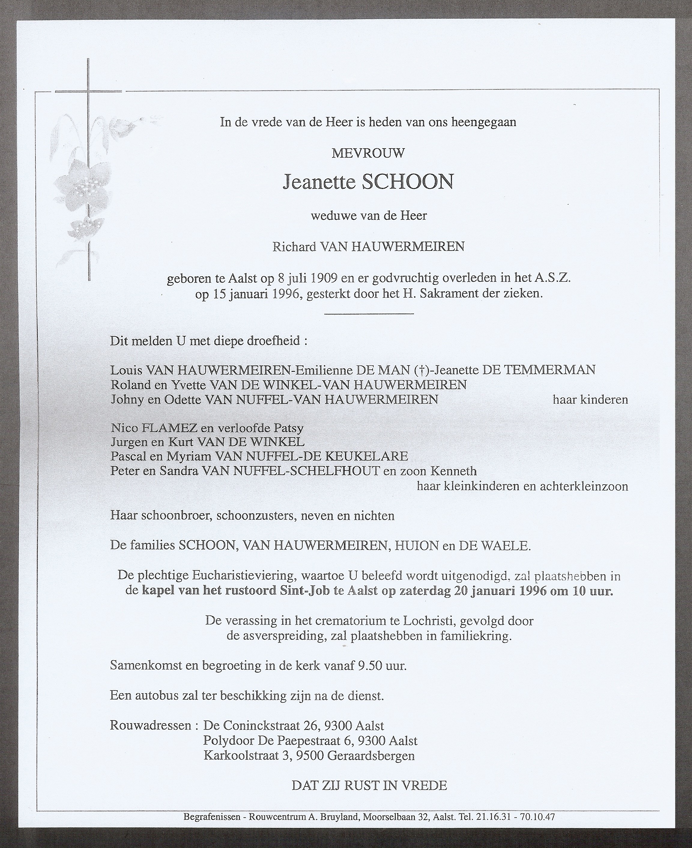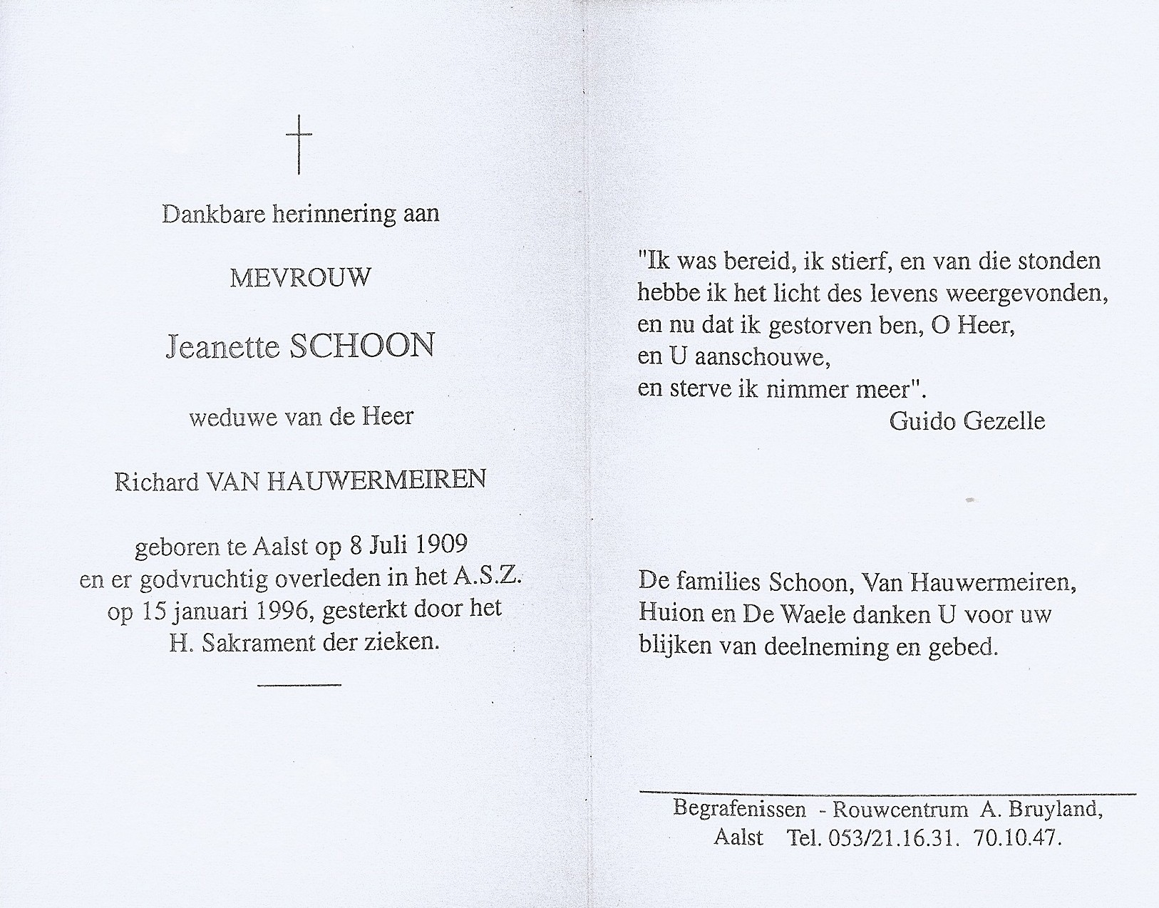 Jeanette Schoon Geboren: 8 juli 1909 — Aalst Overleden: 15 januari 1996 — Aalst |