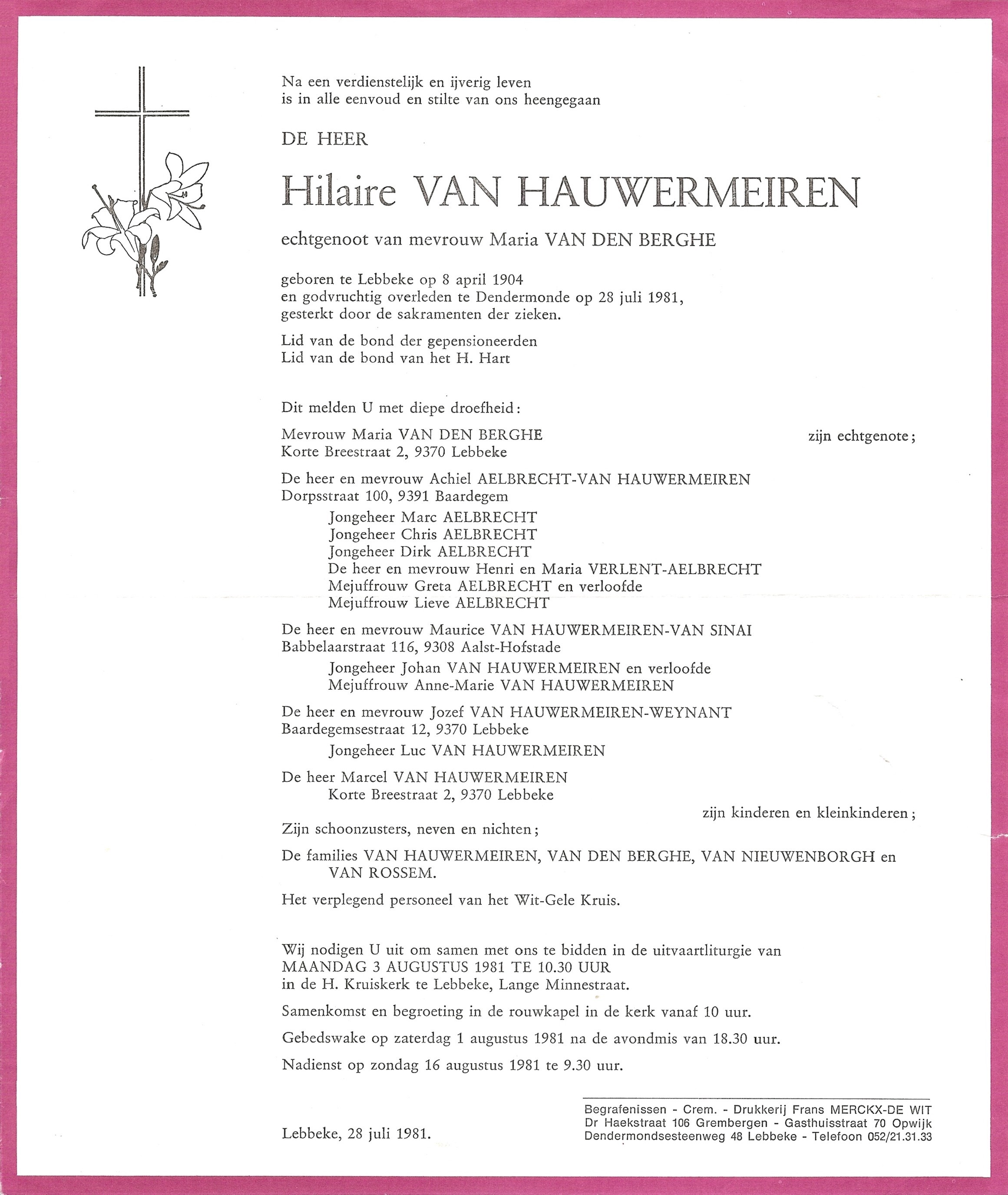 Begrafenis van vader | Hilairius Benedictus Van Hauwermeiren 3 augustus 1981 (Leeftijd 51 jaar) |