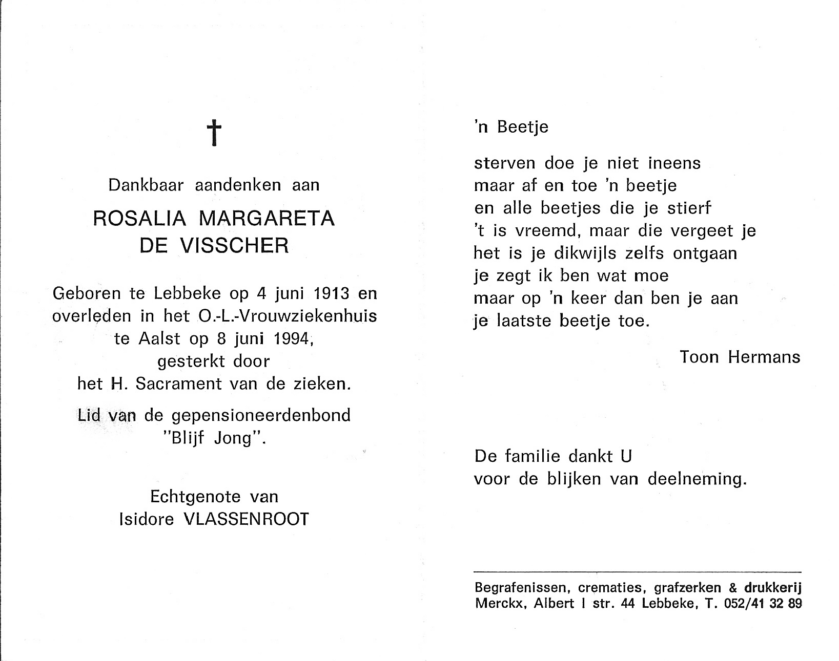 Rosalia Margareta De Visscher Geboren: 4 juni 1913 43 41 — Lebbeke Overleden: 8 juni 1994 — Aalst |