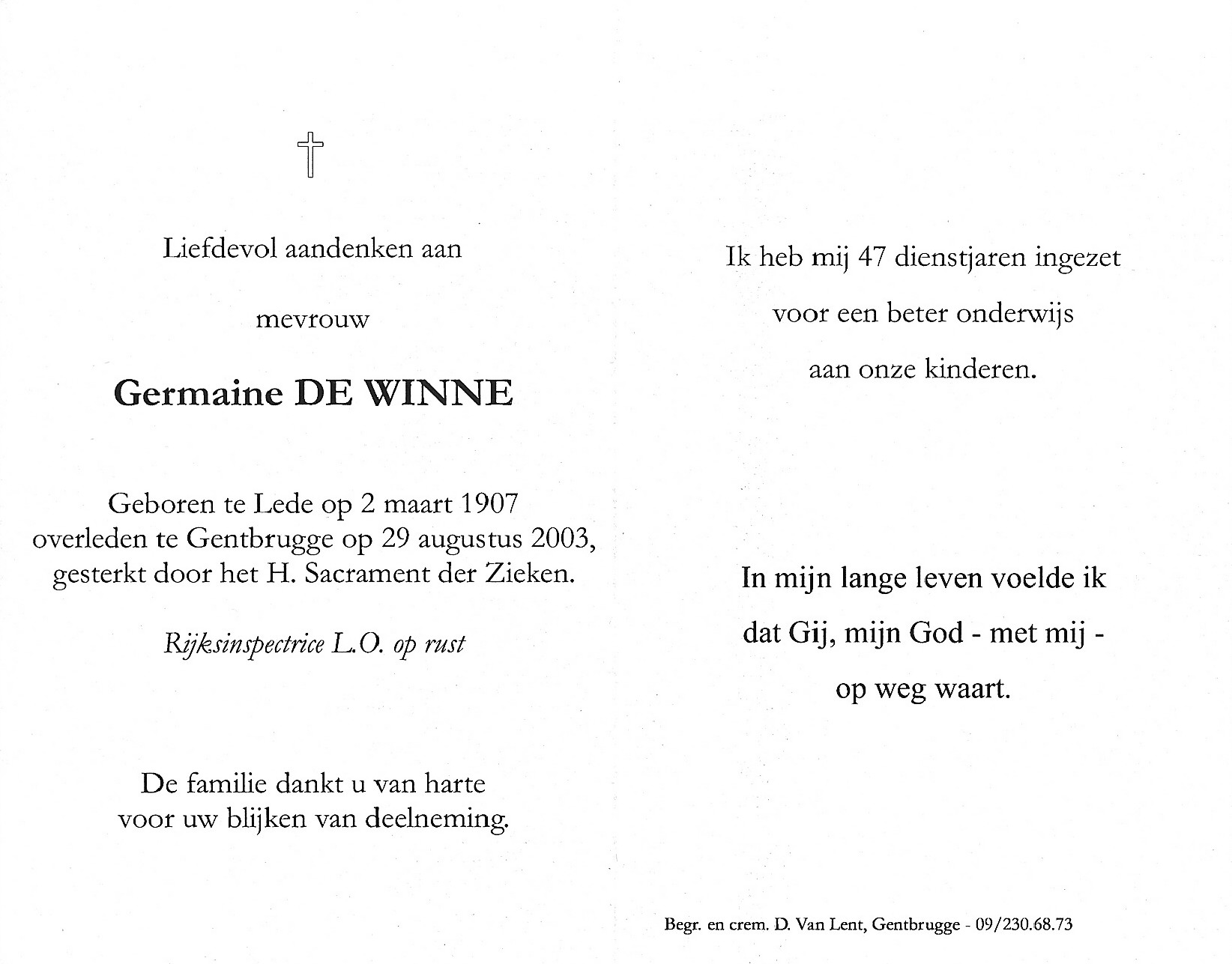 Germaine De Winne Geboren: 2 maart 1907 47 38 — Lede Overleden: 29 augustus 2003 — Gentbrugge |