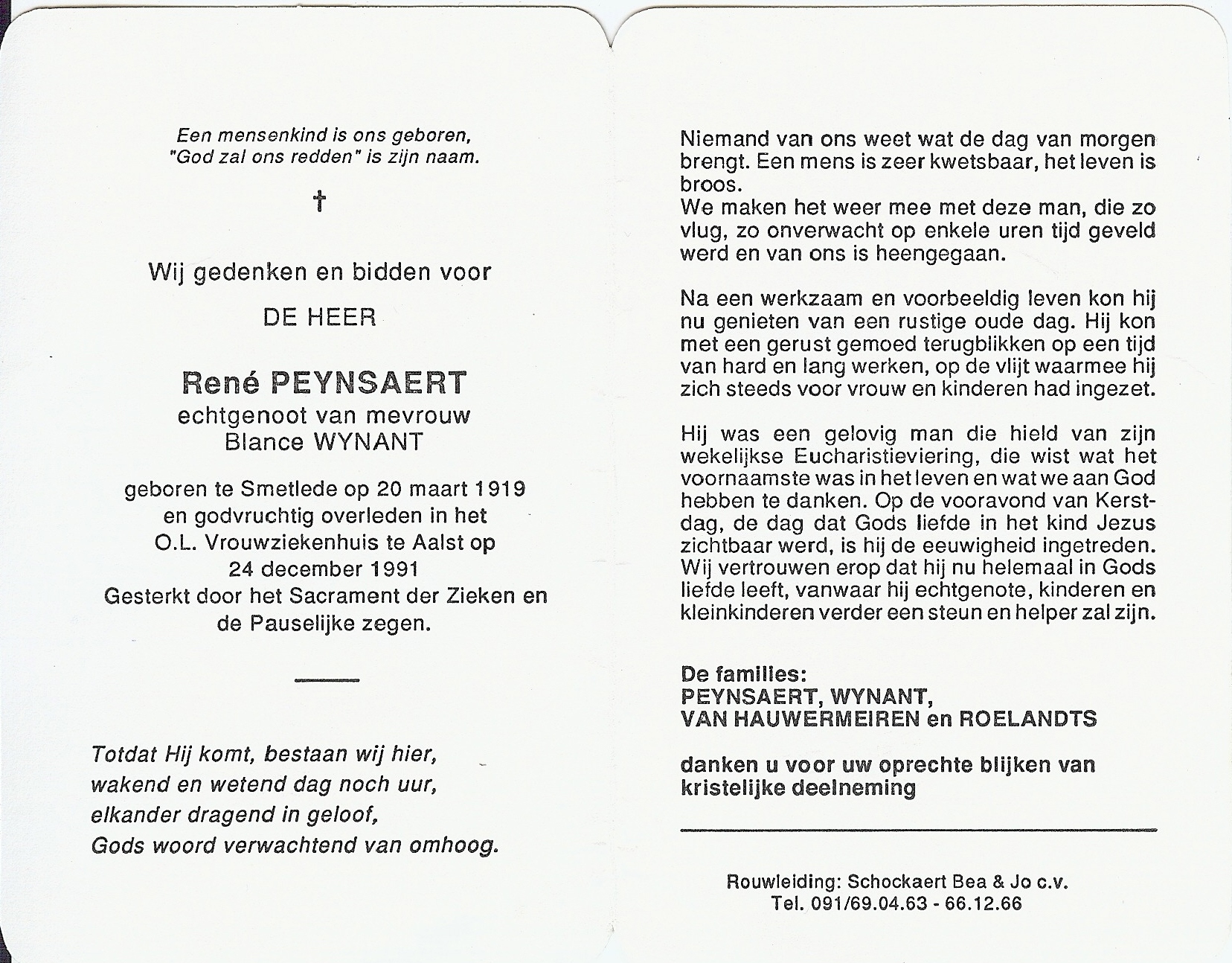 Overlijden van een broer | Renatus Peynsaert 24 december 1991 (Leeftijd 78 jaar) |