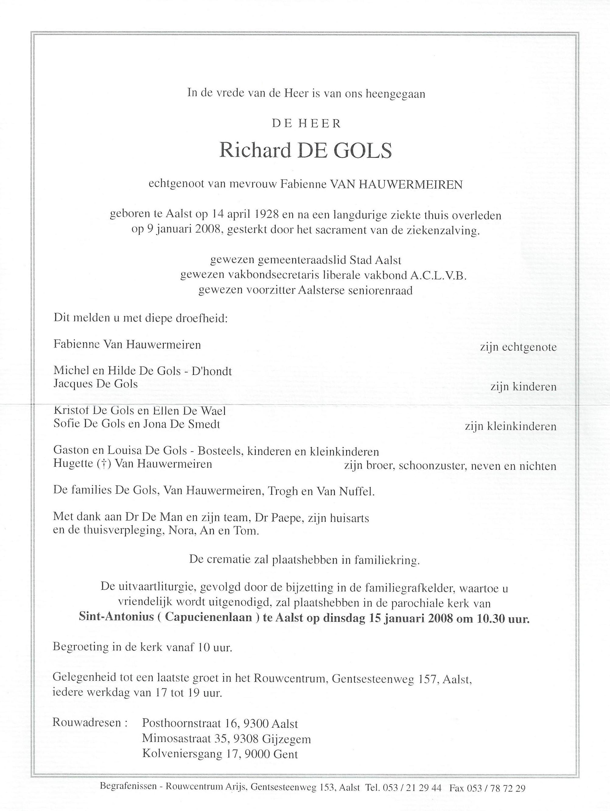 Richard De Gols Geboren: 14 april 1928 — Aalst Overleden: 9 januari 2008 — Aalst |