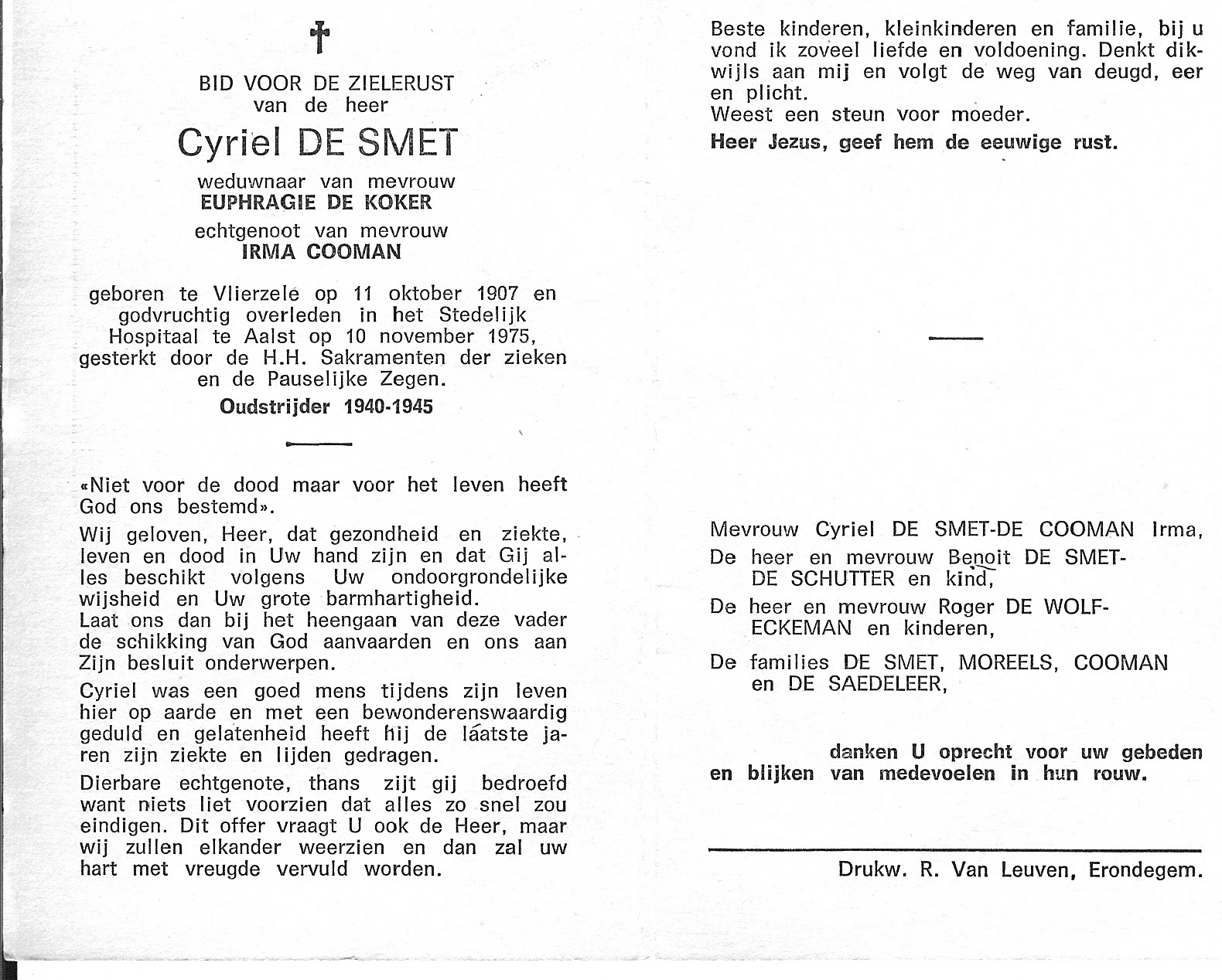 Overlijden van een broer | Cyriel De Smet 10 november 1975 (Leeftijd 71 jaar) Adres: n.v.t.