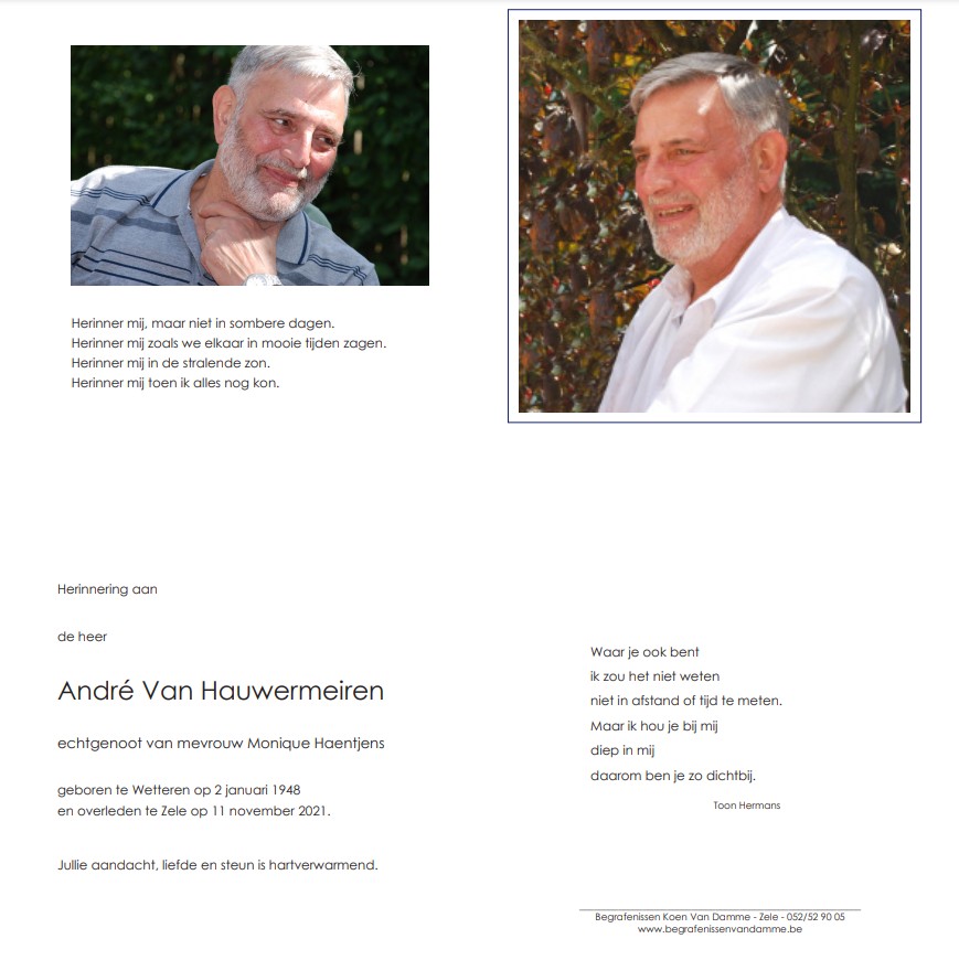 Andre Van Hauwermeiren Geboren: 2 januari 1948 25 22 — Wetteren Overleden: 11 november 2021 — Zele |
