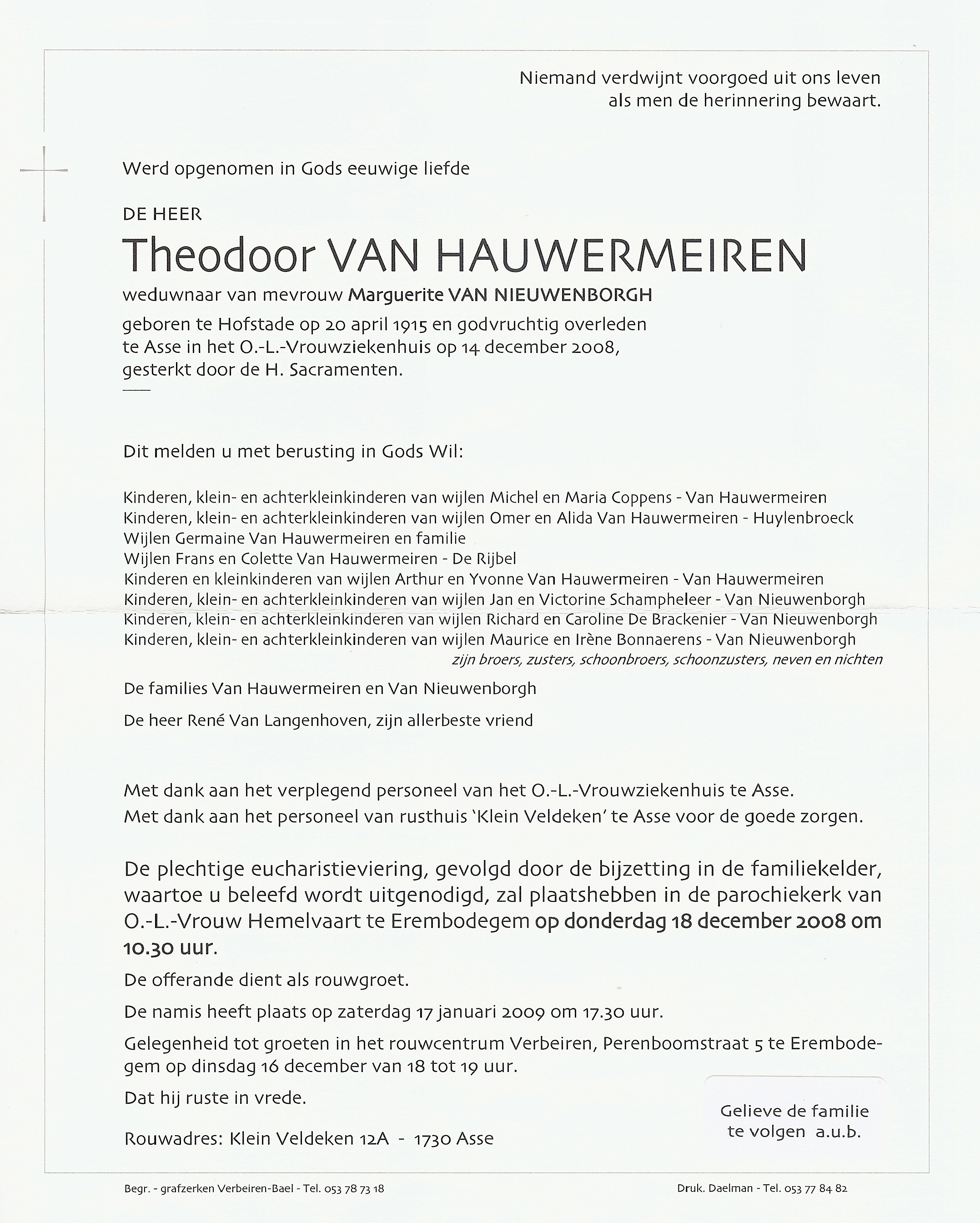 Overlijden van een broer | Theodoor Van Hauwermeiren 14 december 2008 (Leeftijd 98 jaar) |