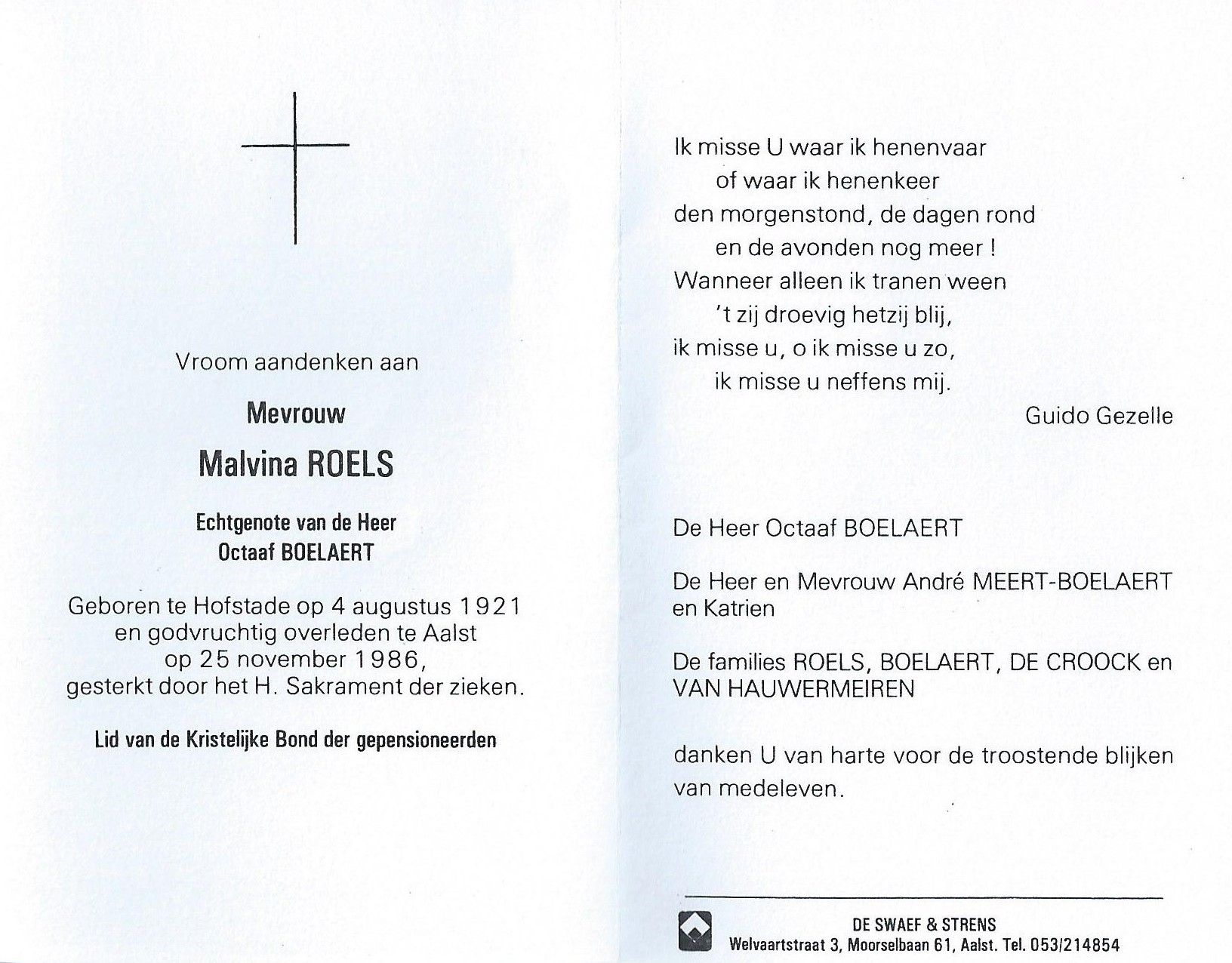 Malvina Roels Geboren: 4 augustus 1921 — Hofstade Overleden: 25 november 1986 — Aalst |
