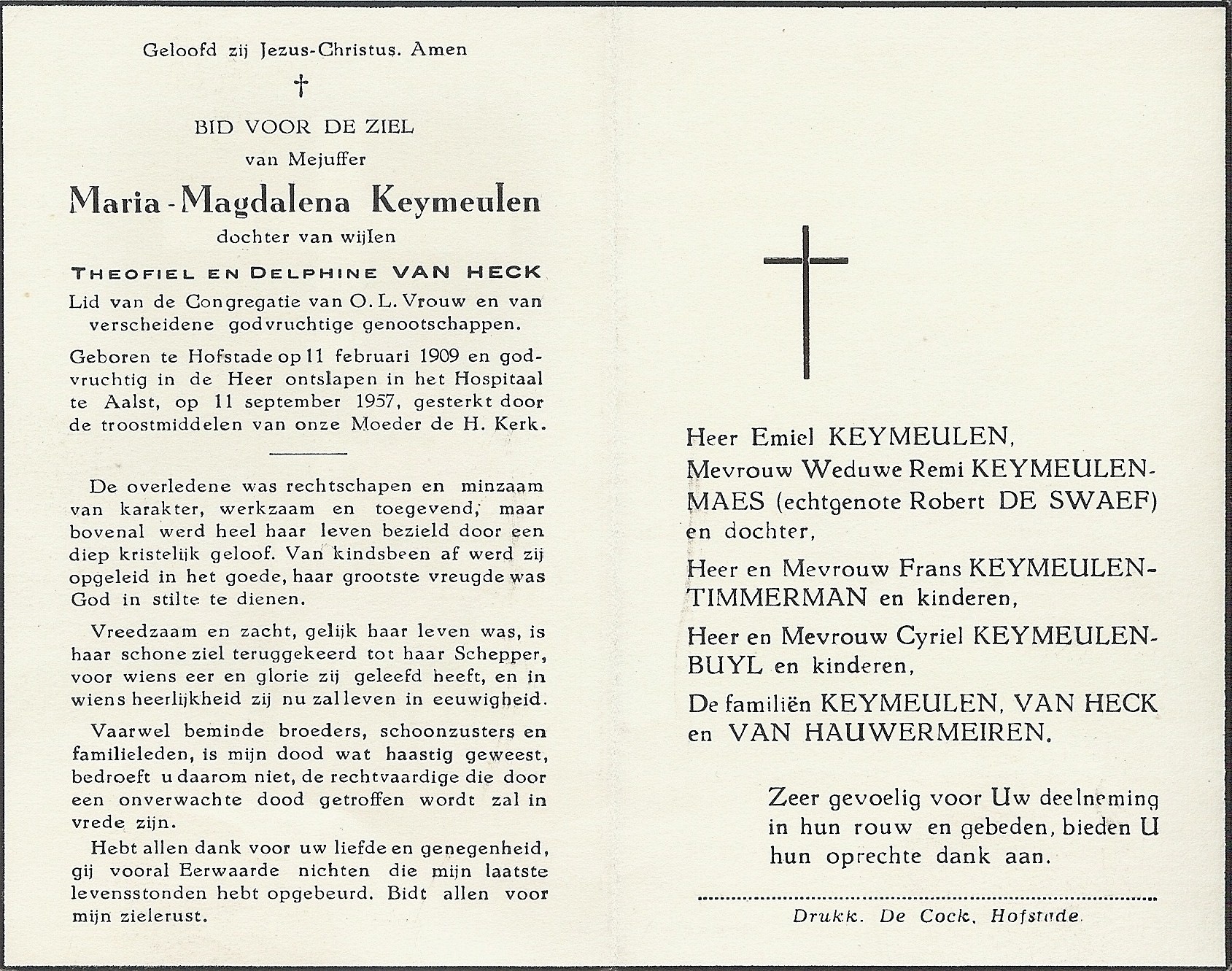 Maria-Magdalena Keymeulen Geboren: 11 februari 1909 35 37 — Hofstade Overleden: 11 september 1957 — Aalst |