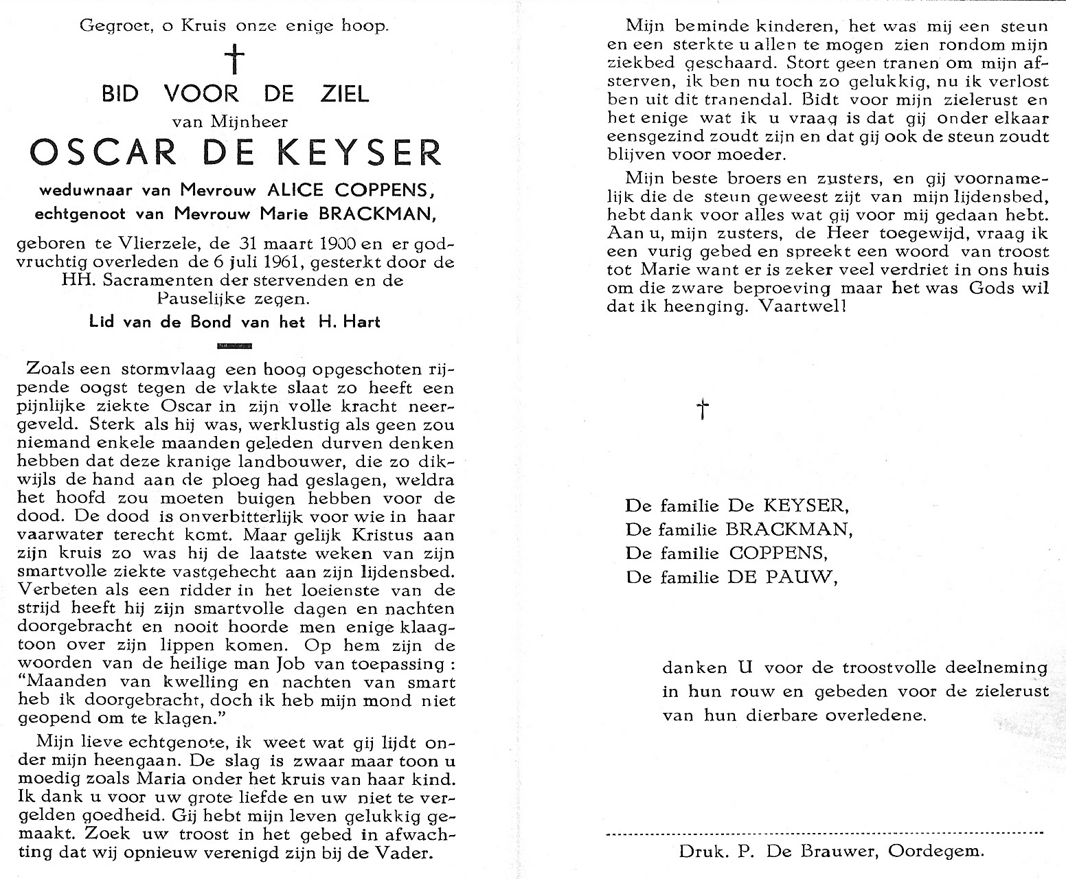 Oscar De Keyser Geboren: 31 maart 1900 — Vlierzele Overleden: 6 juli 1961 — Vlierzele |