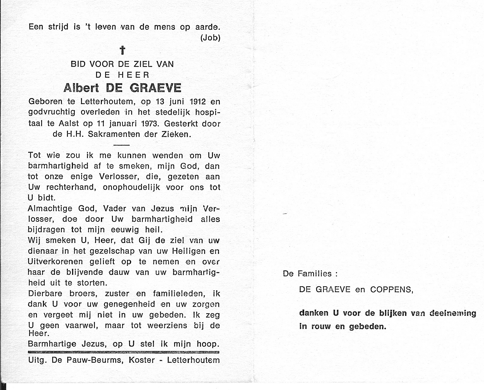 Overlijden van een broer | Albert De Graeve 11 januari 1973 (Leeftijd 68 jaar) Adres: n.v.t.