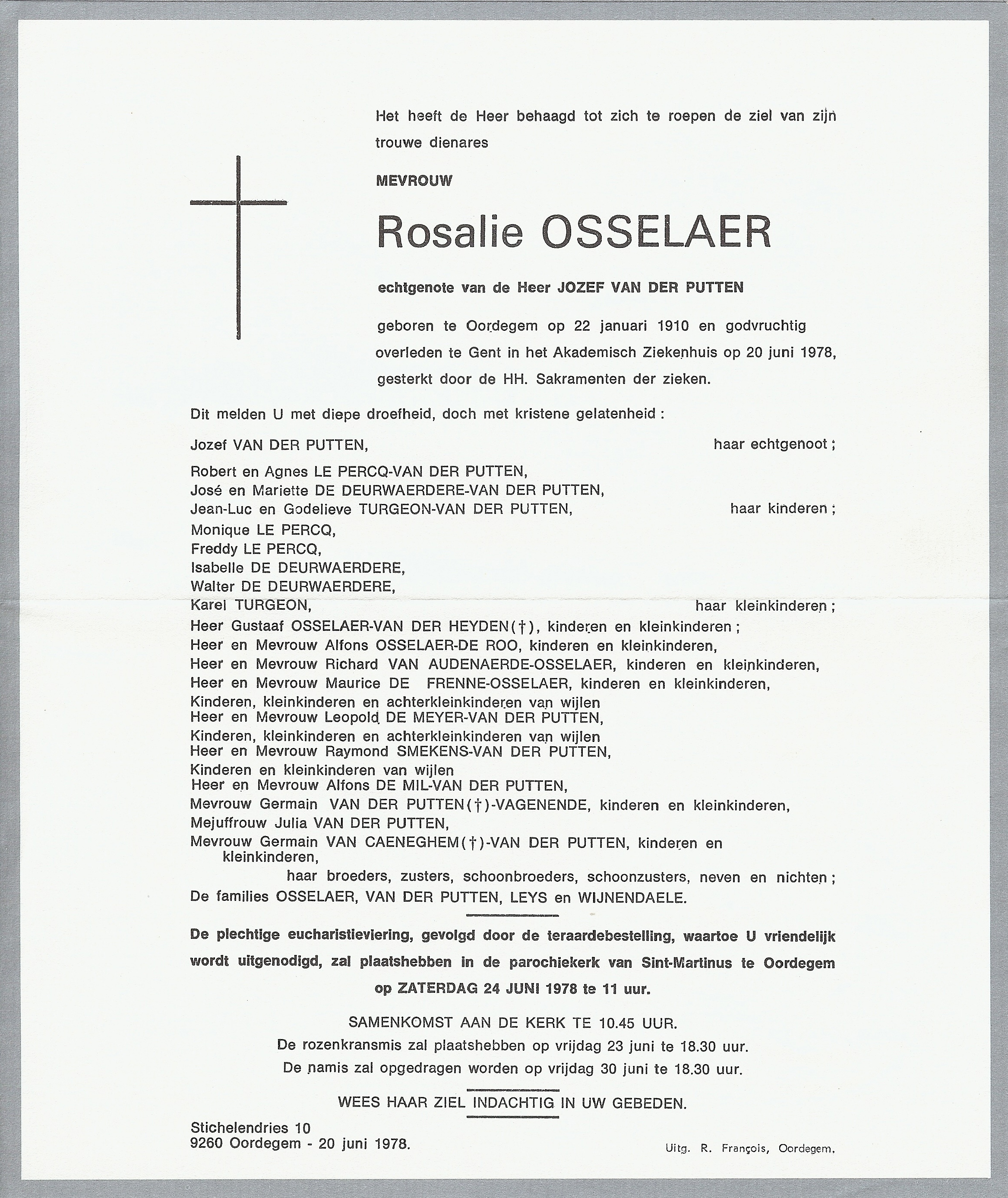 | Rosalie Osselaer | 22 januari 1910 | 116 | Oordegem | 3 | 20 juni 1978 | 47 | 68 | Gent | 13 mei 2011 - 16:58:00 | F | YES | Y100 | R | |||