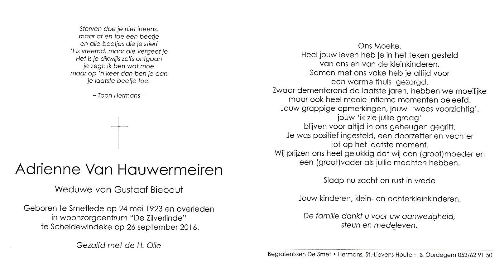 | Andrea Bernadette Van Hauwermeiren | 24 mei 1923 | 102 | Smetlede | 3 | 27 september 2016 | 9 | 93 | Scheldewindeke | 14 februari 2021 - 15:14:00 | F | YES | Y100 | ||||