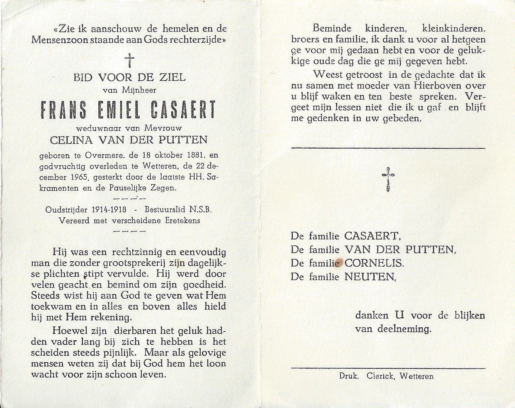 Franciscus Emiel Casaert Geboren: 18 oktober 1881 — Overmere Overleden: 22 december 1965 — Wetteren |