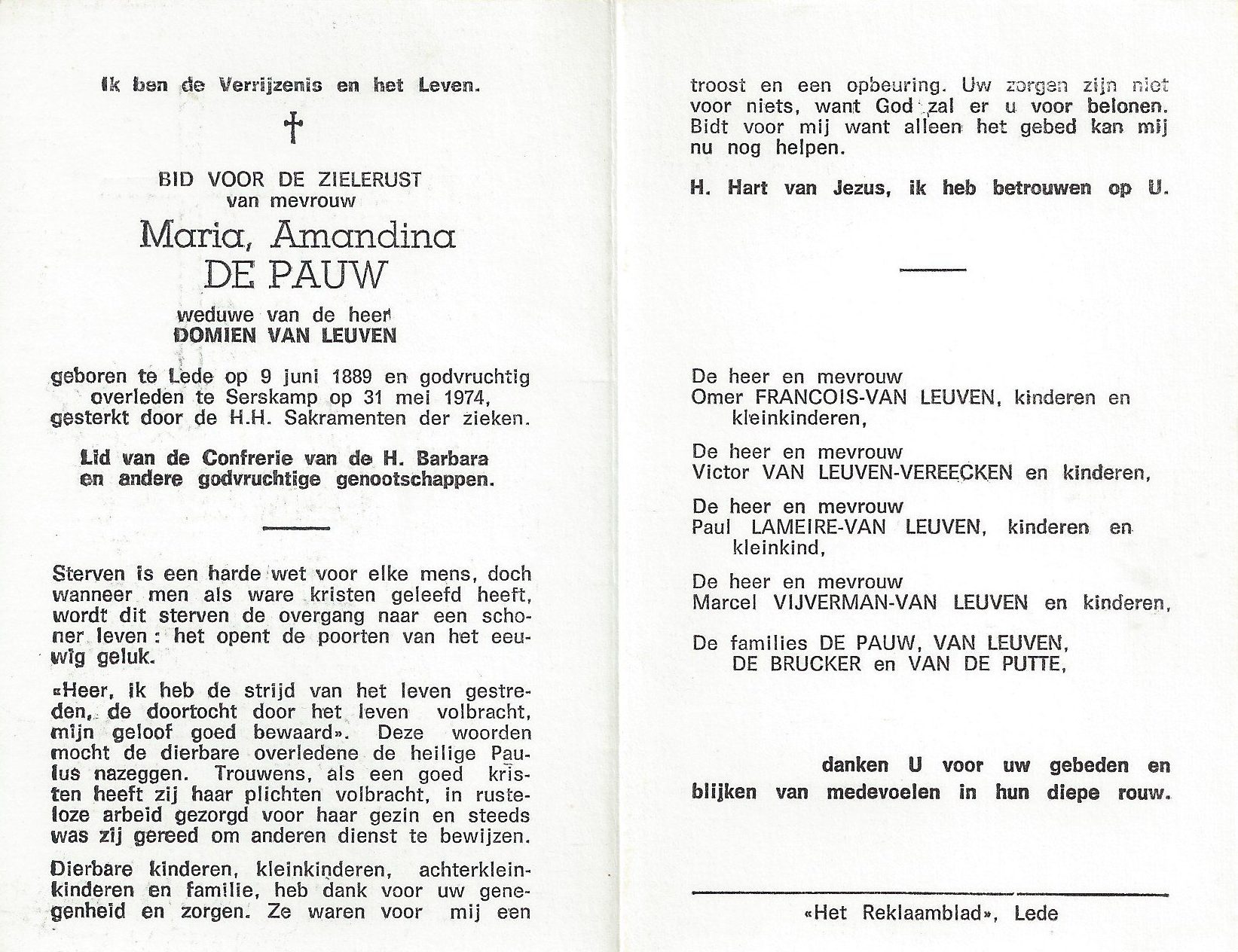Maria Amandina De Pauw Geboren: 9 juni 1889 — Lede Overleden: 31 mei 1974 — Serskamp |