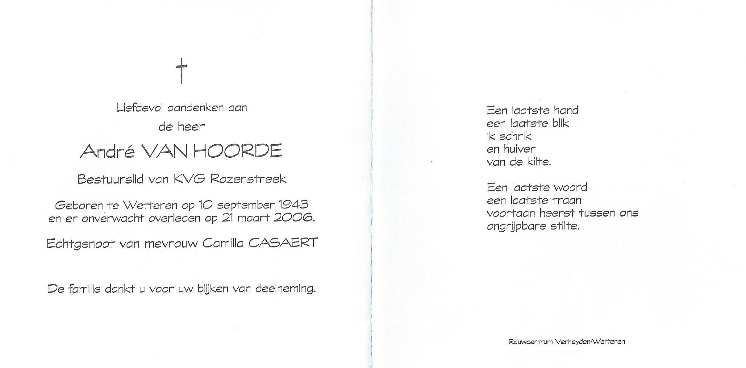 Overlijden van een echtgenoot | André Van Hoorde 21 maart 2006 (Leeftijd 59 jaar) |