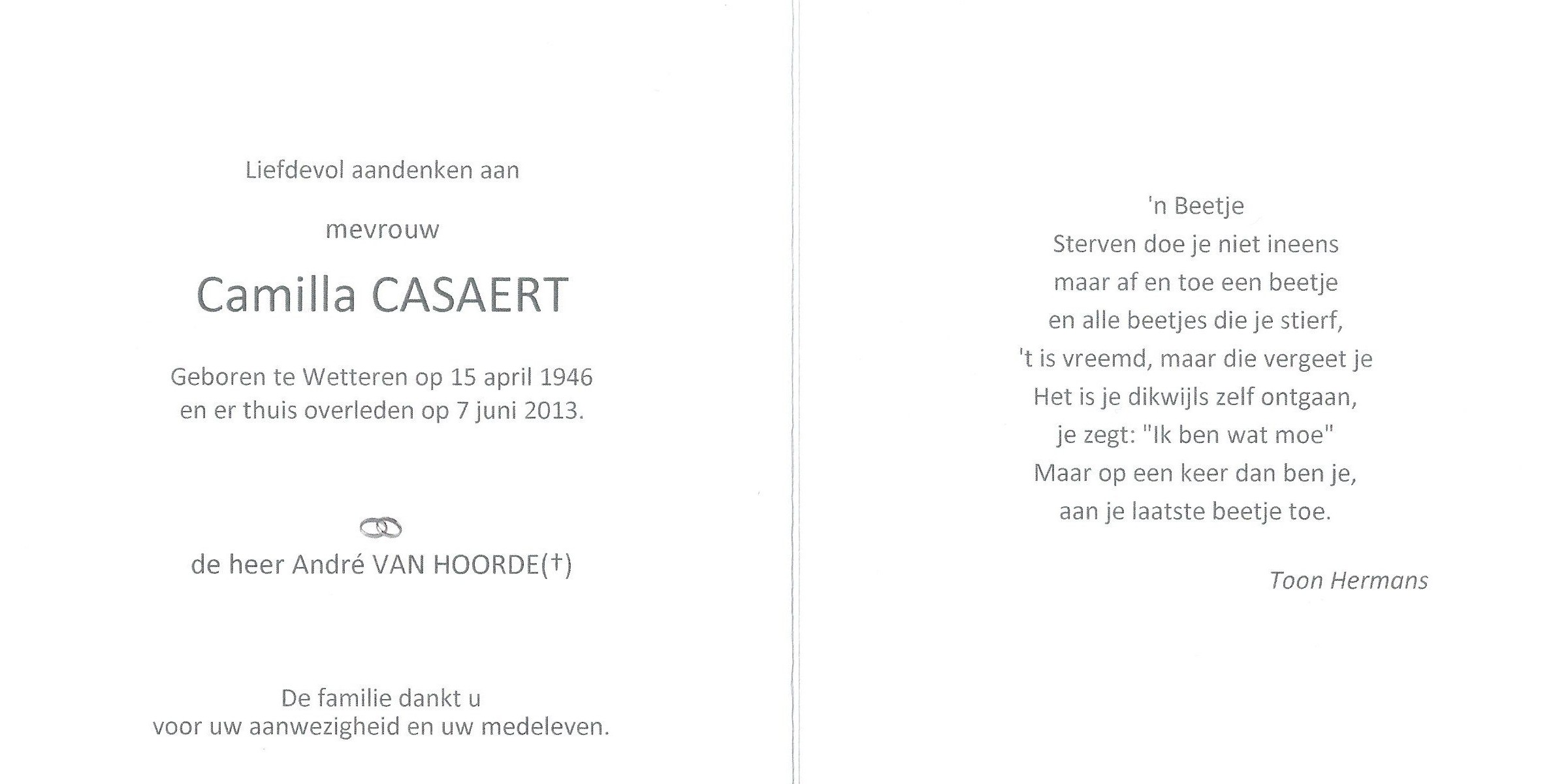 Camilla Casaert Geboren: 15 april 1946 32 32 — Wetteren Overleden: 7 juni 2013 — Wetteren |