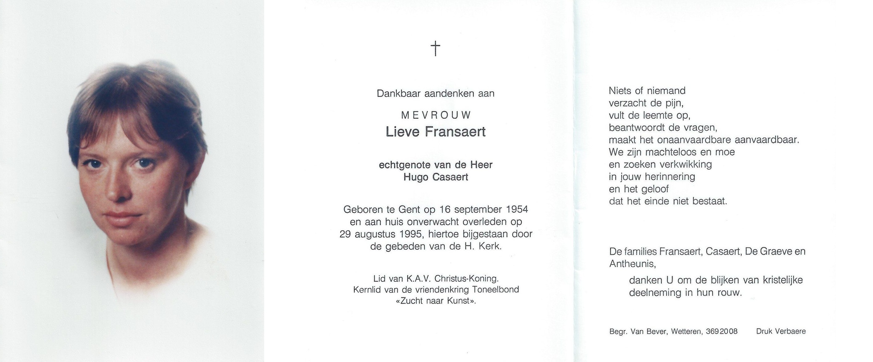 Lieve Fransaert Geboren: 16 september 1954 — Gent Overleden: 29 augustus 1995 — Wetteren |